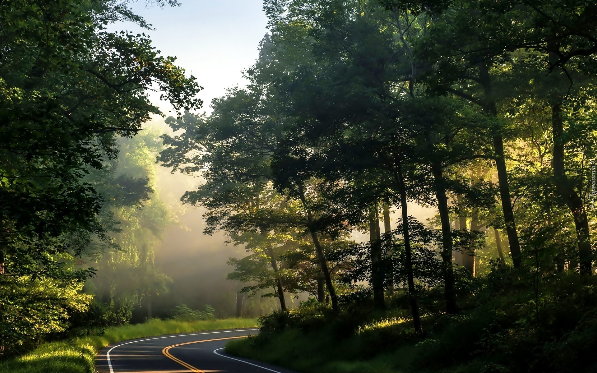 Edytor tapety: Droga, Las, Mgła, Przebijające, Światło