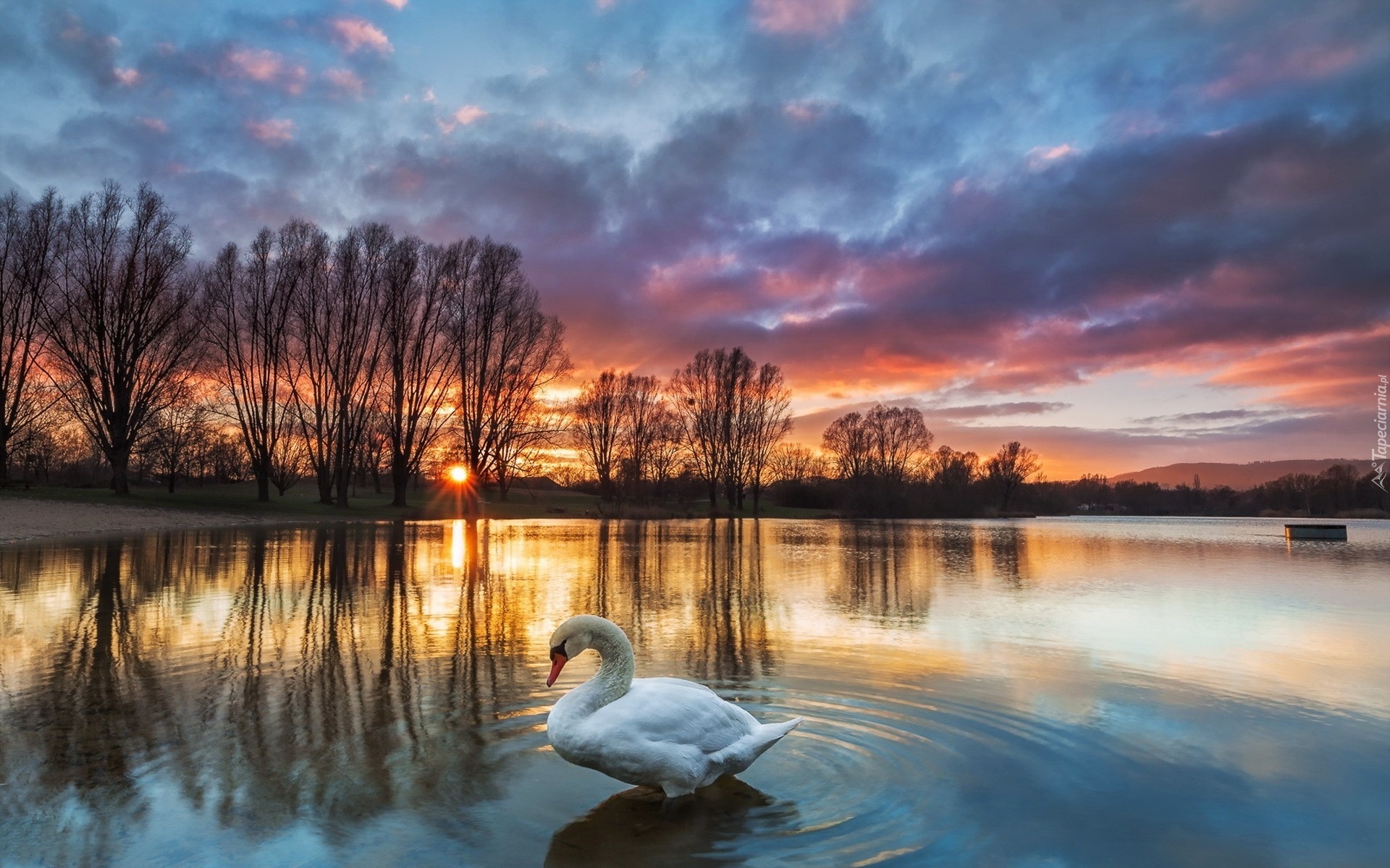 Edytor tapety: Jezioro, Łabędź, Zachód słońca