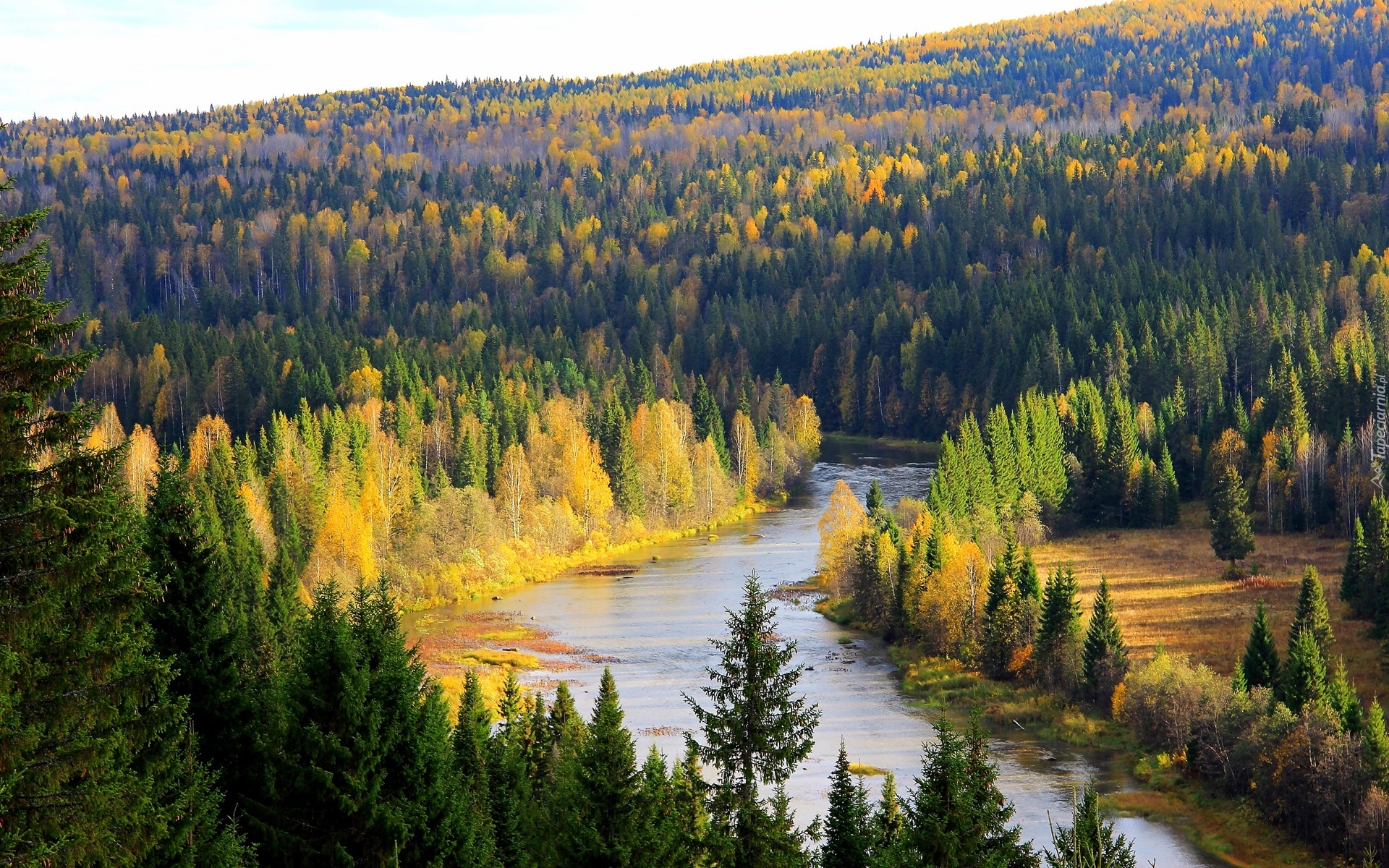 Edytor tapety: Las, Rzeka, Wzgórza