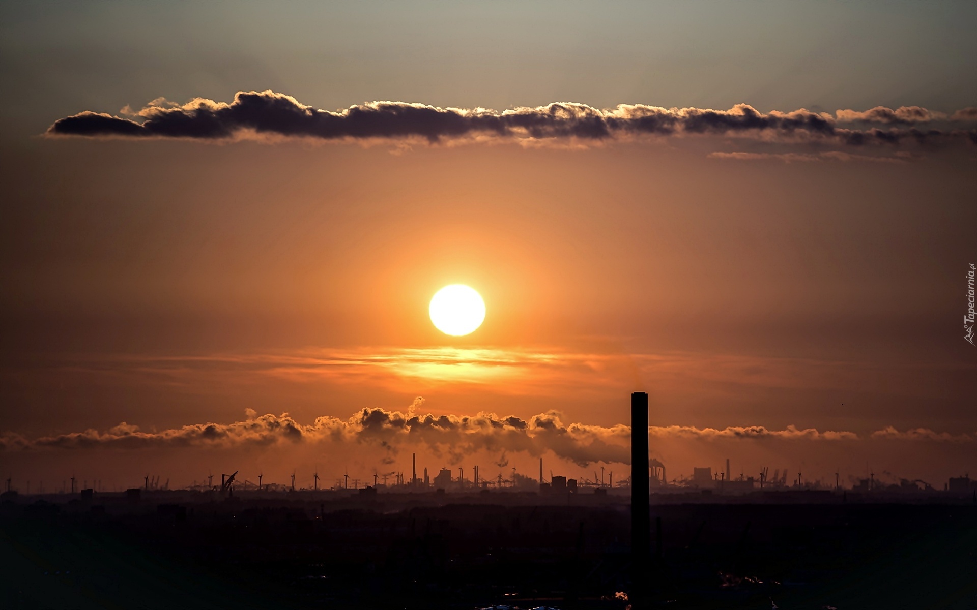 Edytor tapety: Zachód, Słońca, Chmury, Budowle, Fabryki, Kominy, Dym