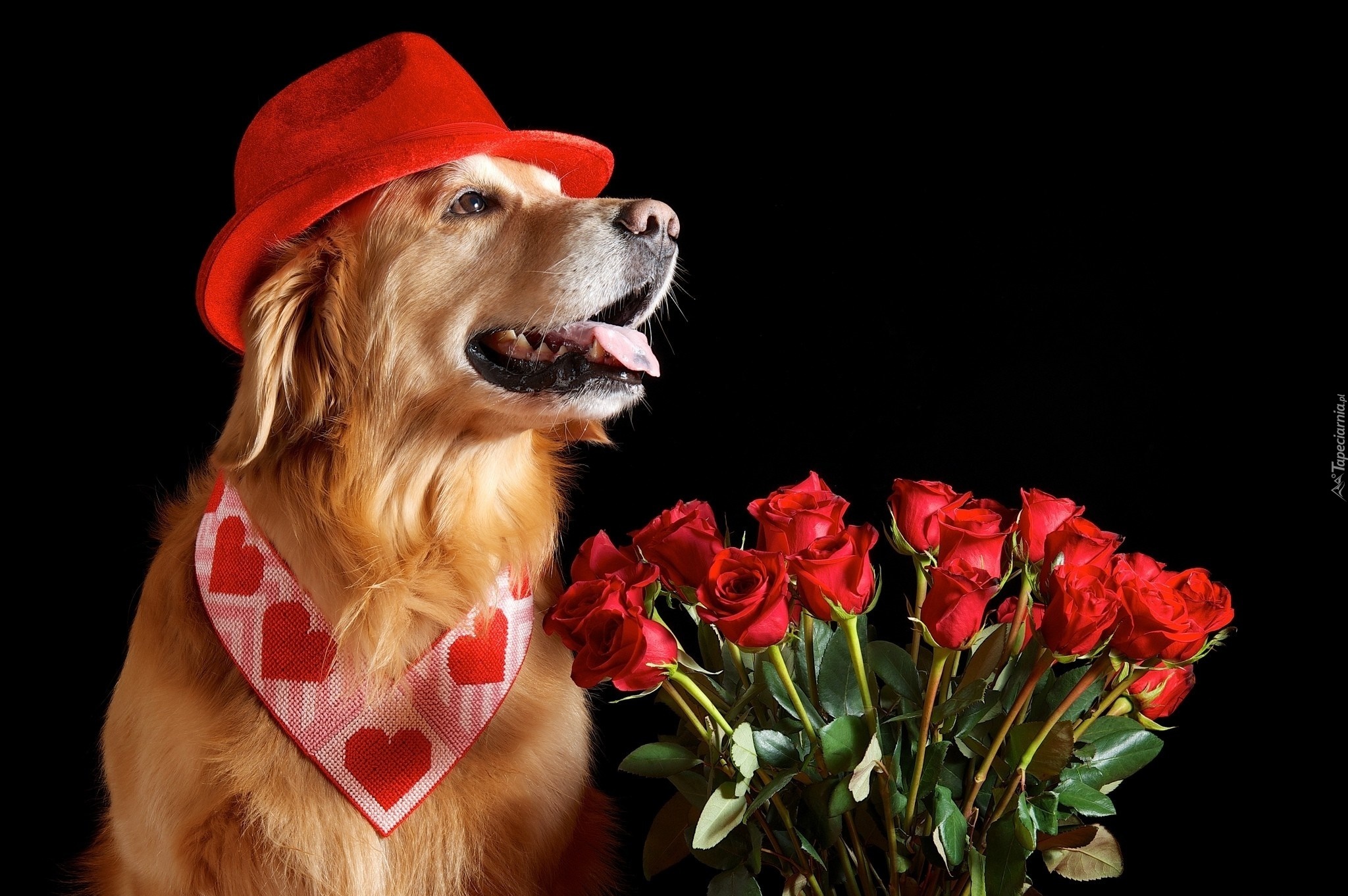 Edytor tapety: Piesek, Czerwone, Róże, Walentynki, Golden Retriever