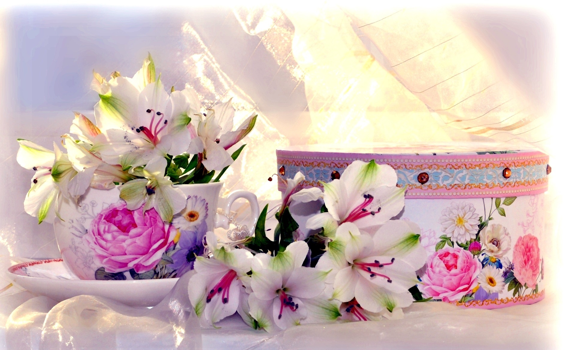 Edytor tapety: Alstremeria, Filiżanka, Kwiatowa, Szkatułka, Tiulowa, Tkanina, Kompozycja