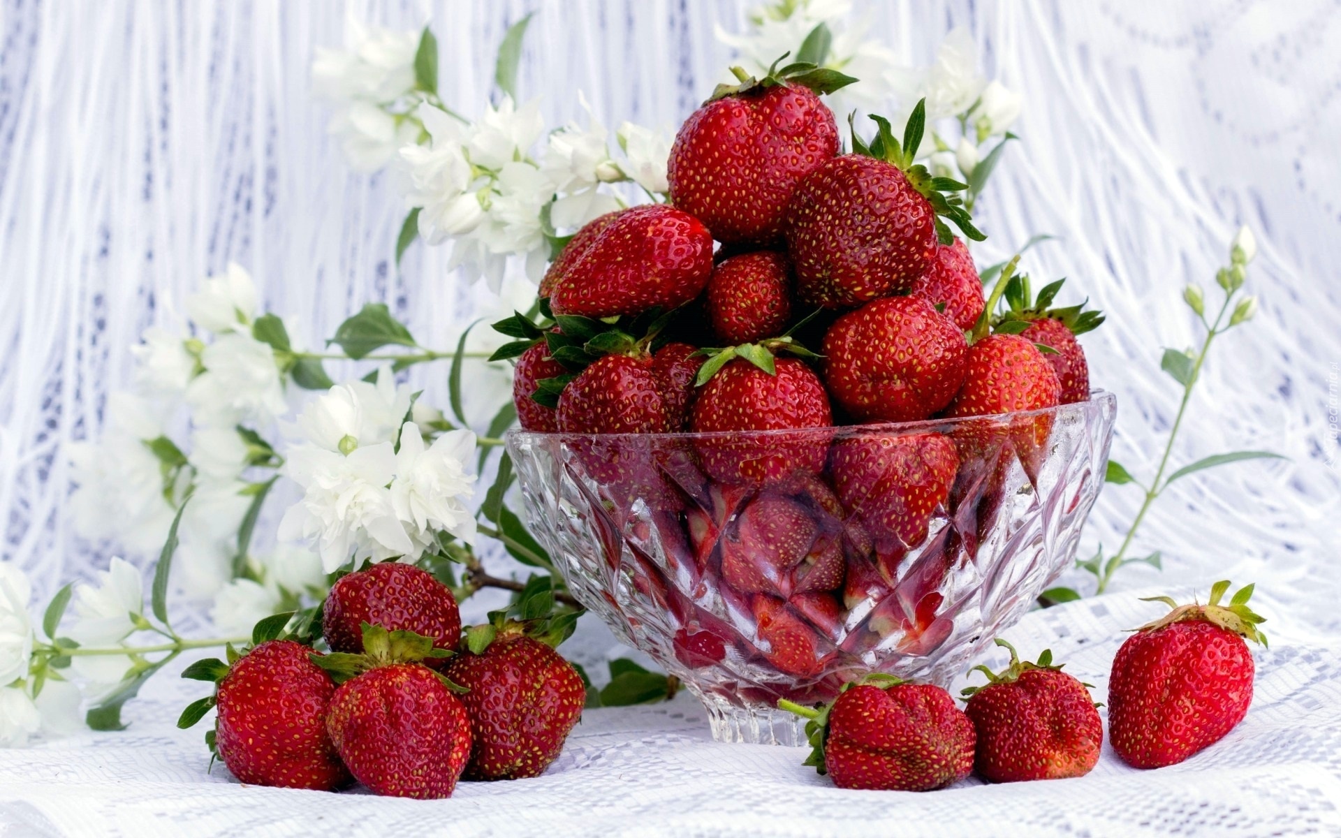 Edytor tapety: Truskawki, Miseczka, Białe, Kwiaty