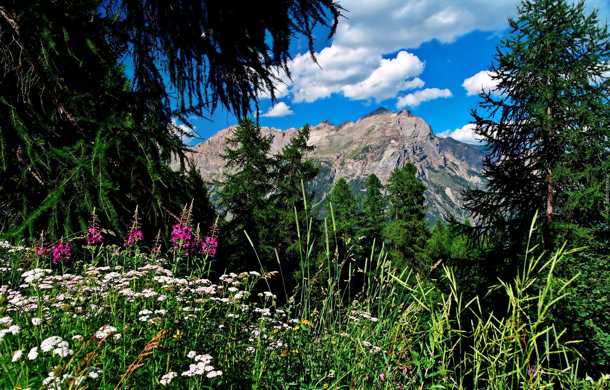 Edytor tapety: Góry, Obłoki, Świerki, Polne, Kwiaty