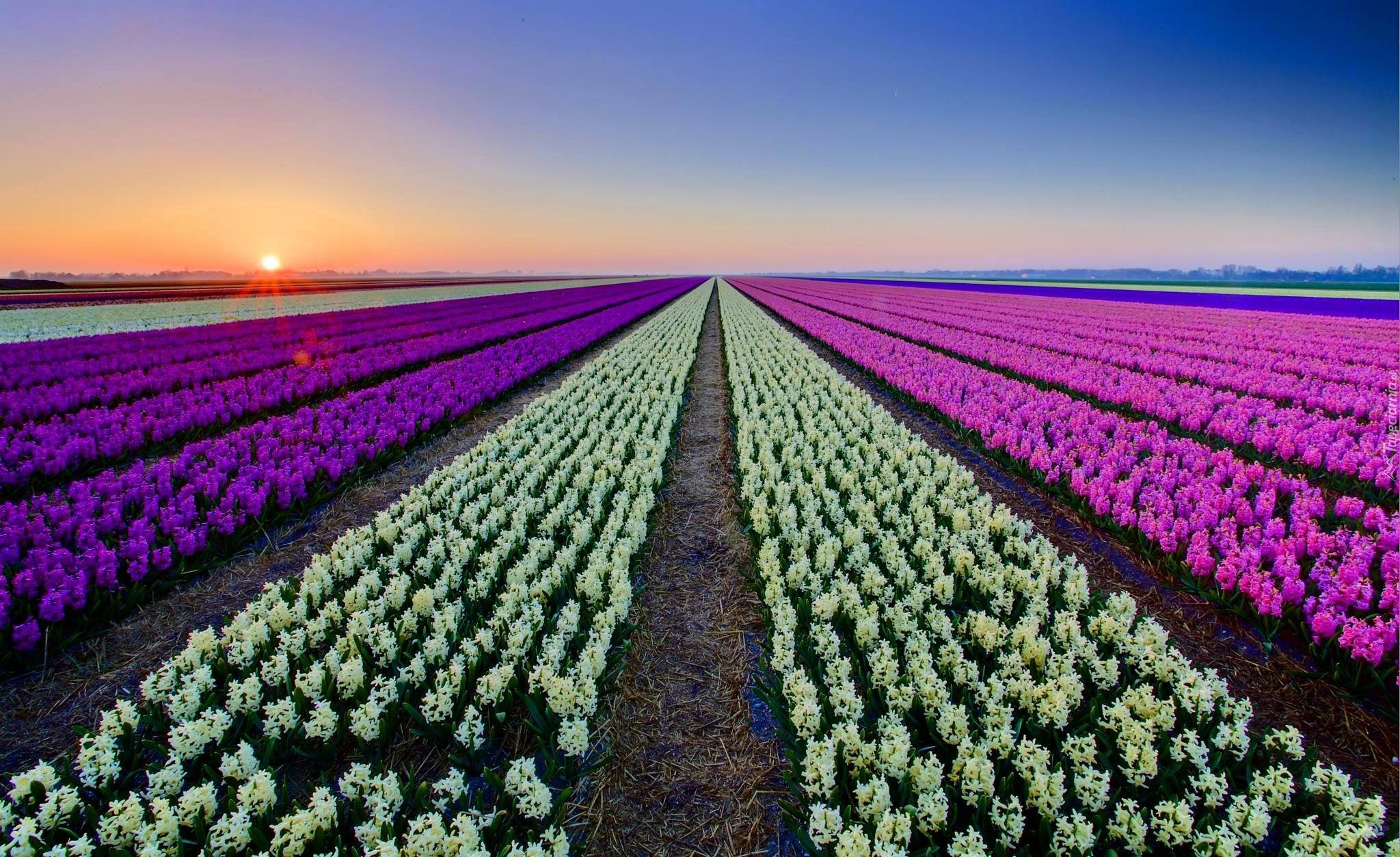 Edytor tapety: Hiacynty, Pole, Zachód Słońca