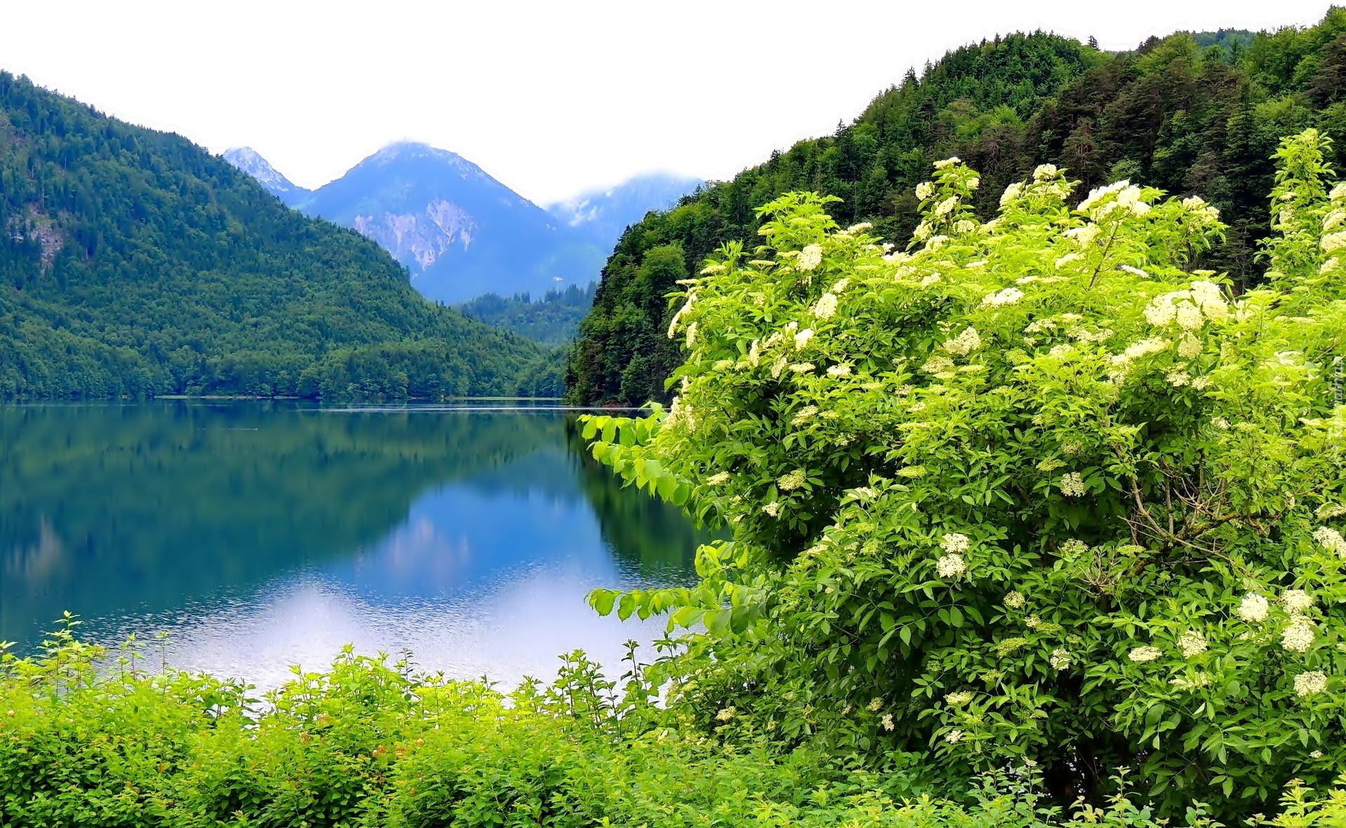 Edytor tapety: Góry, Las, Jezioro, Kwitnący, Krzew
