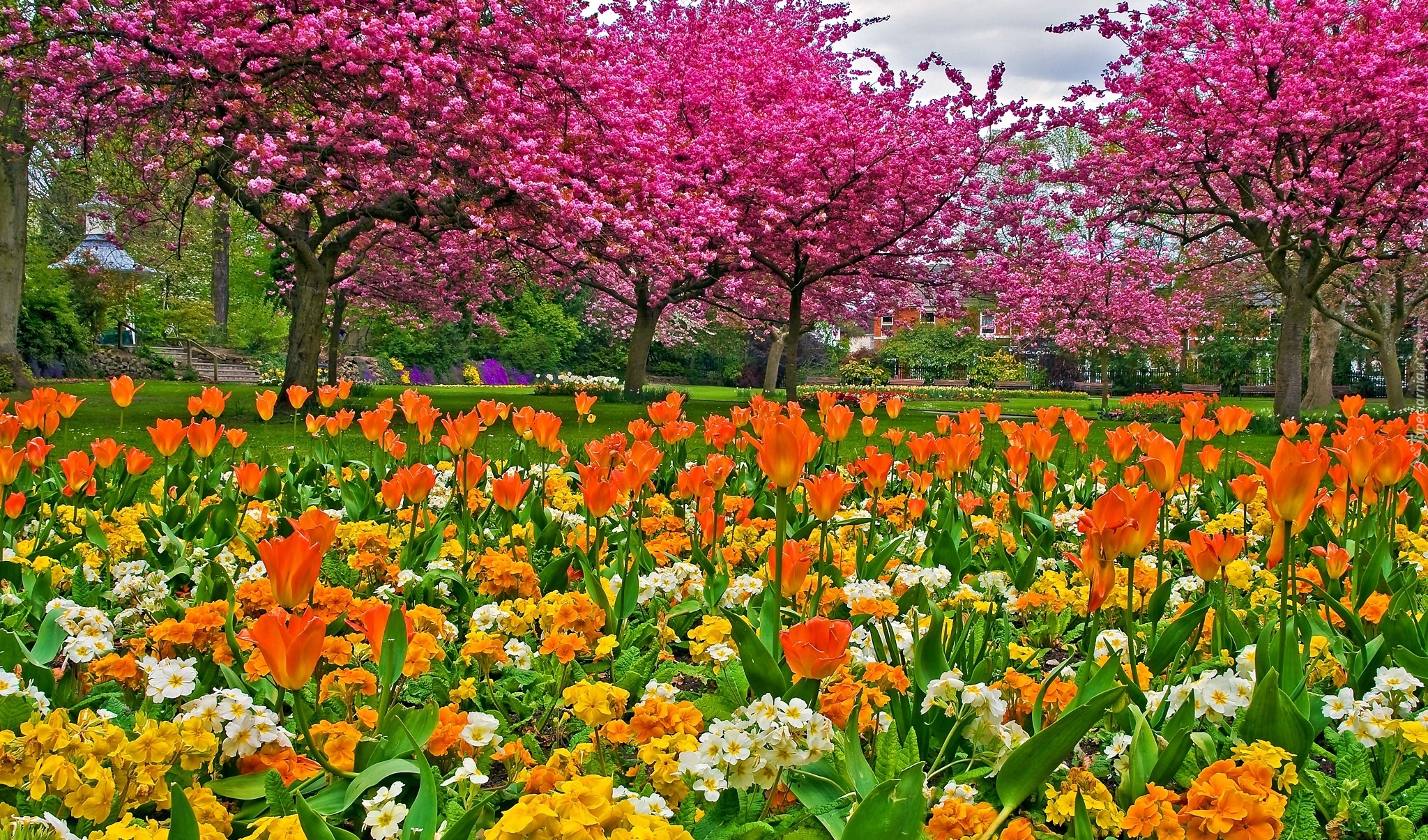 Edytor tapety: Park, Tulipany, Kwitnące, Drzewa, Wiosna
