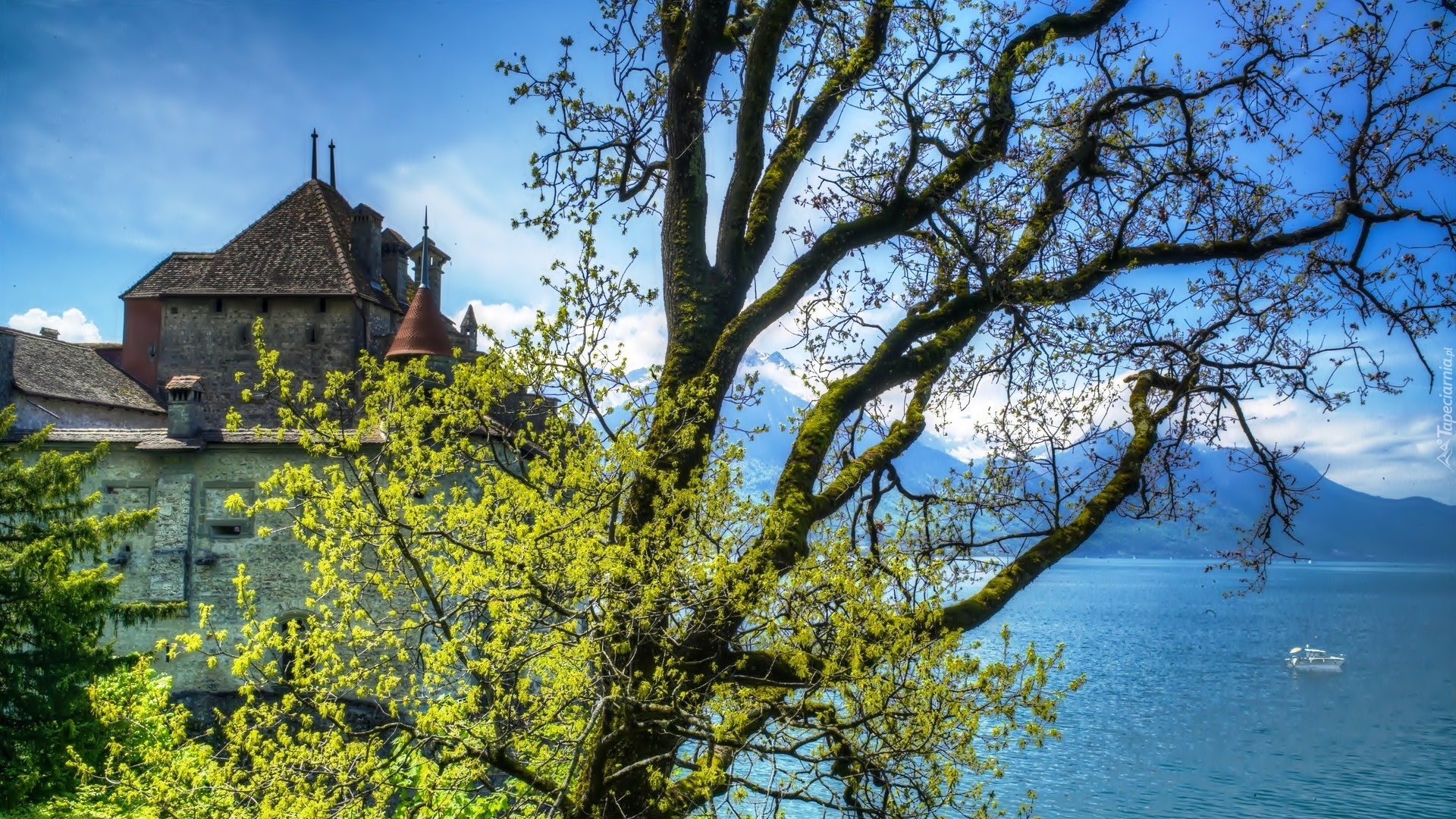 Edytor tapety: Klasztor, Góry, Jezioro, Drzewo