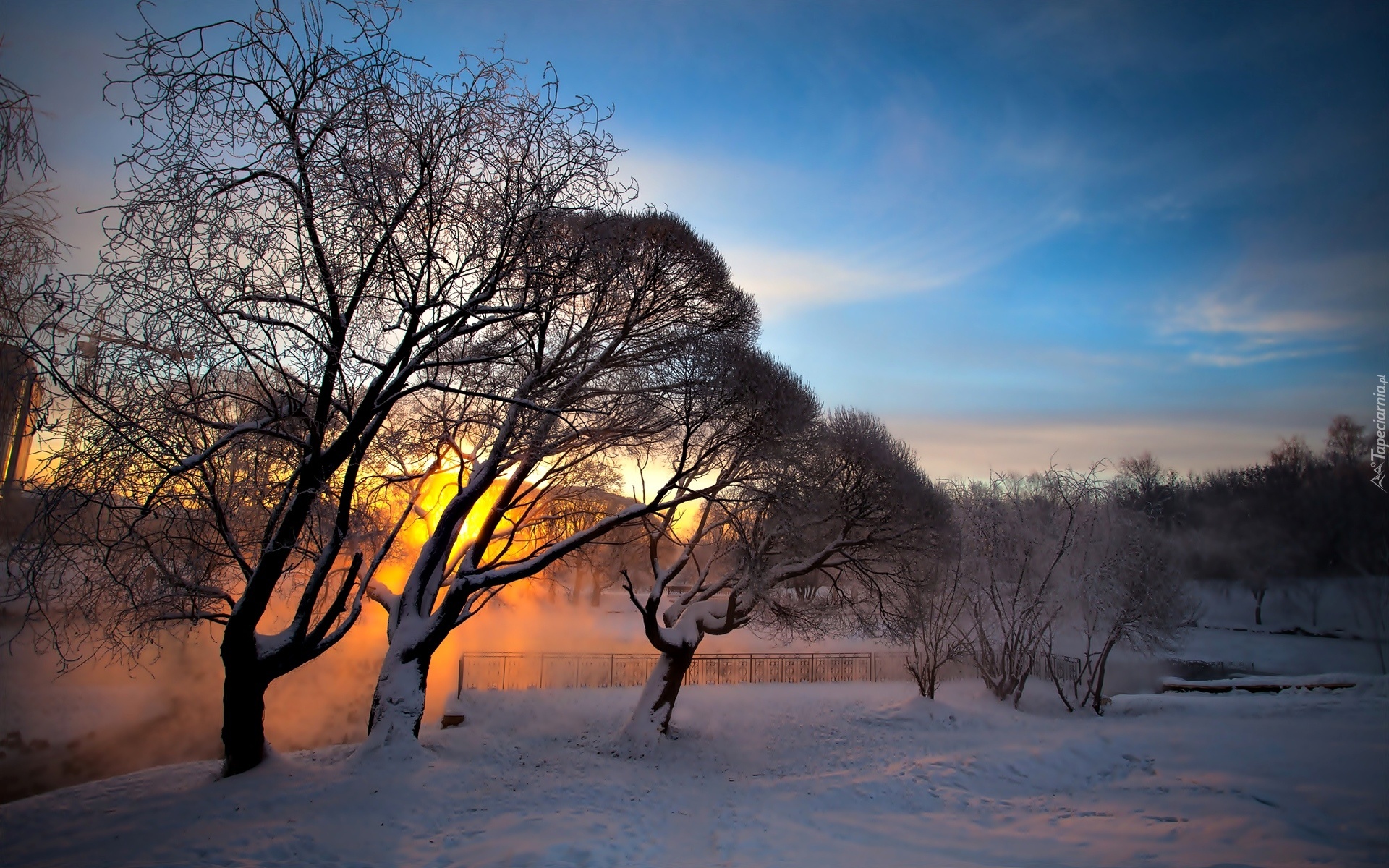 Edytor tapety: Zima, Śnieg, Drzewa, Wschód słońca