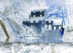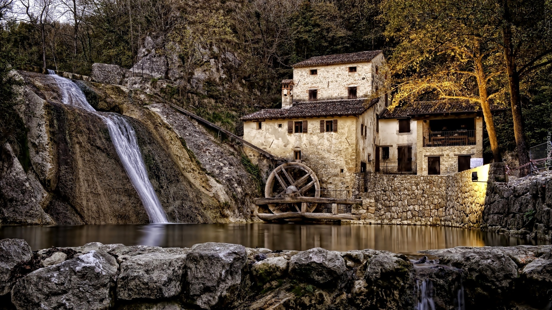 Edytor tapety: Młyn, Wodospad, Skały, Drzewa