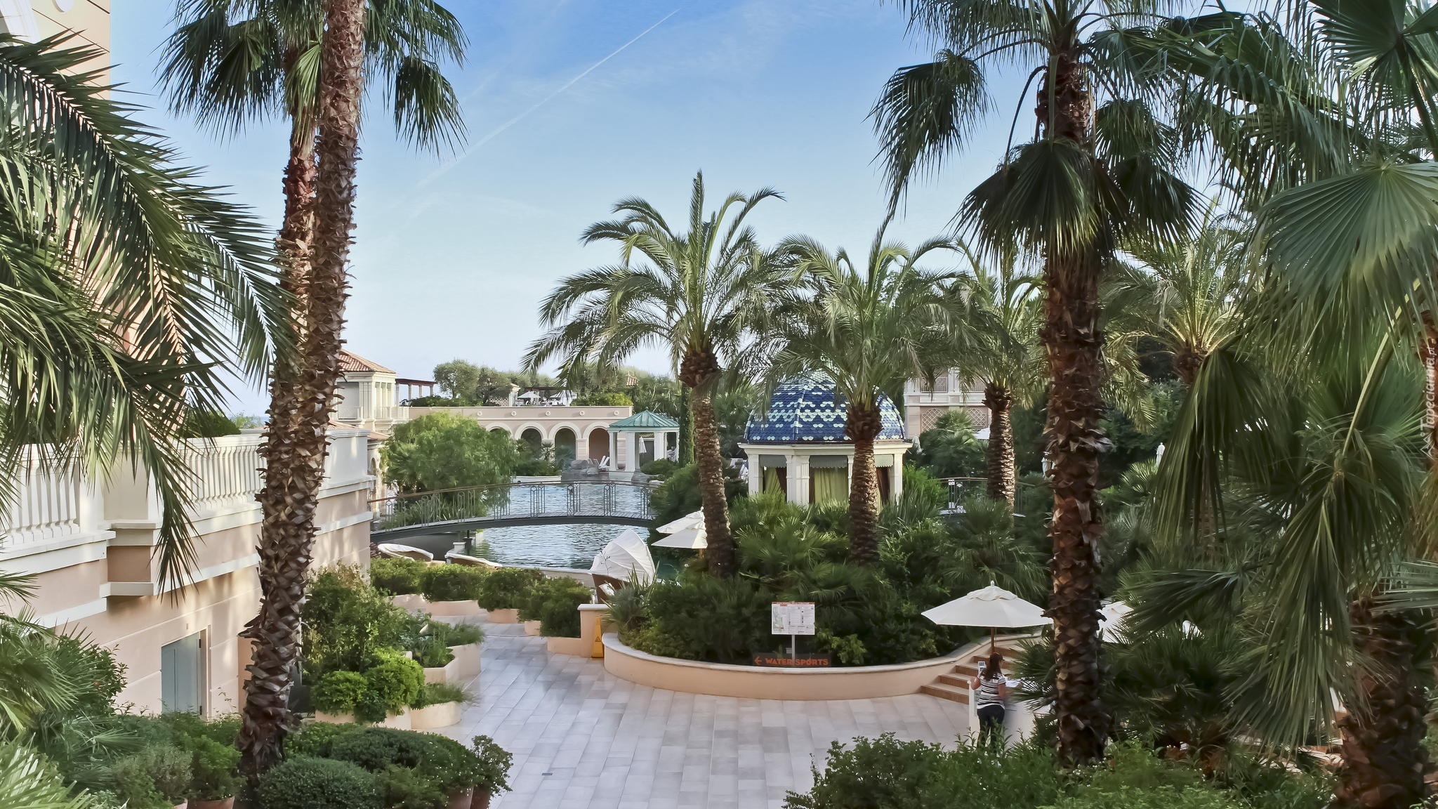 Edytor tapety: Monako, Hotel, Monte Carlo, Palmy, Dziedziniec, Basen, Parasole, Altana