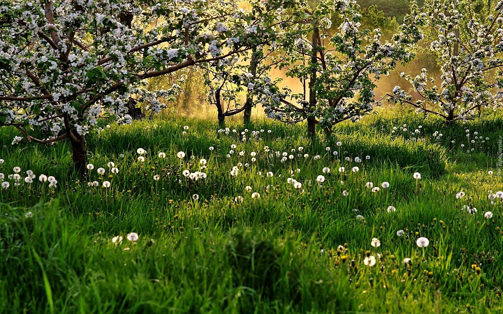 Edytor tapety: Wiosna, Kwitnące, Drzewa, Łąka, Dmuchawce