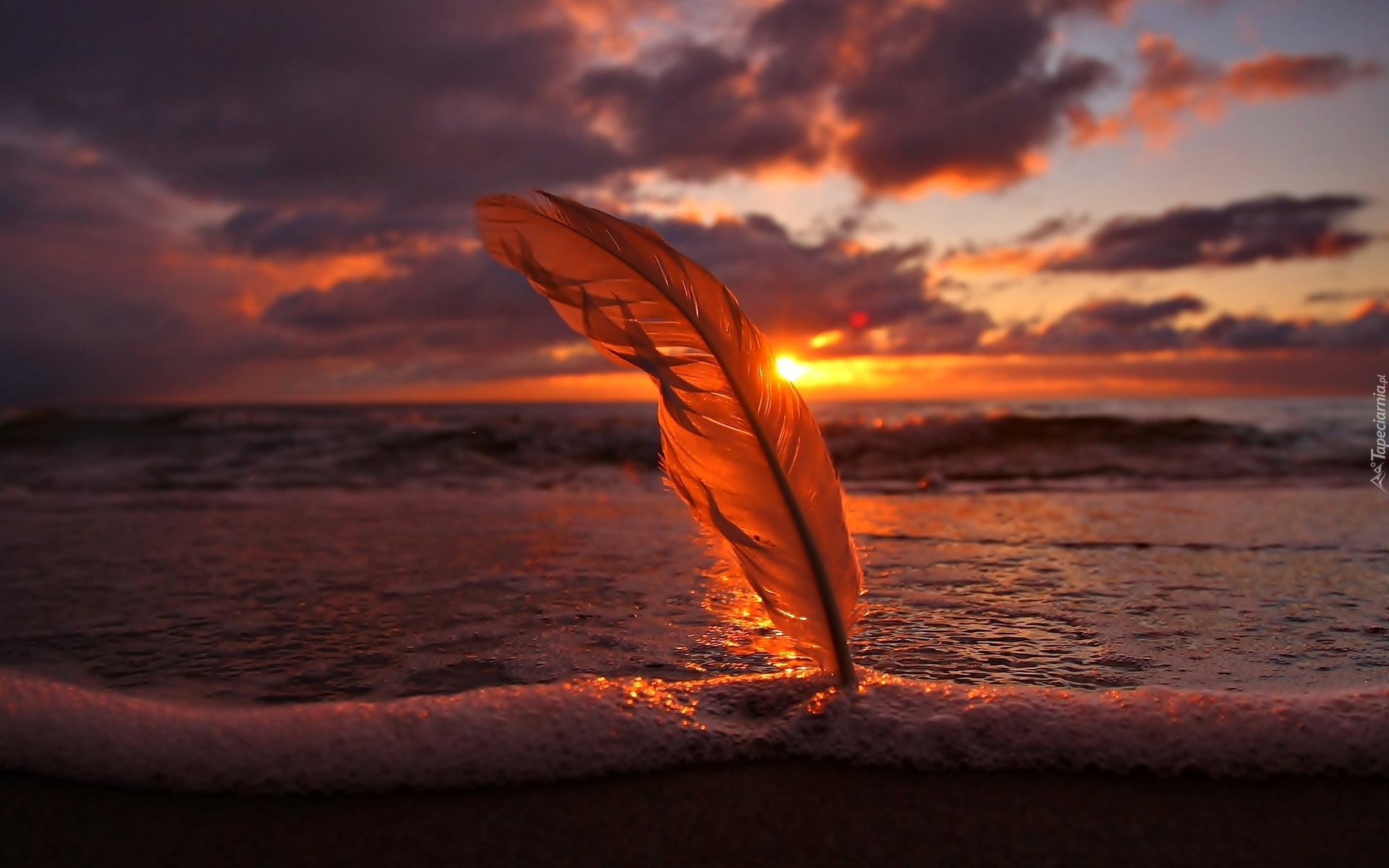 Edytor tapety: Morze, Zachód Słońca, Pióro, Piasek, Plaża