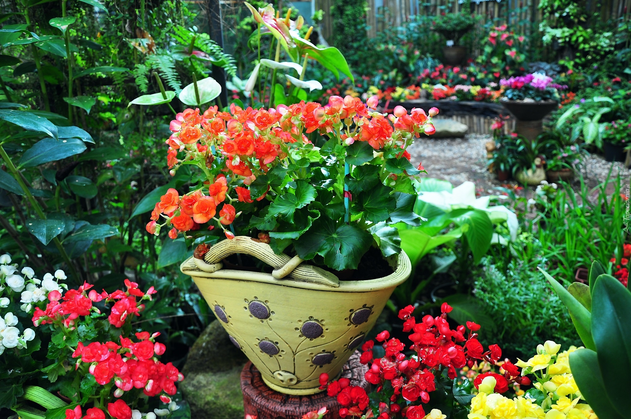 Edytor tapety: Kwiaty, Begonie, Waza, Ogród, Staw