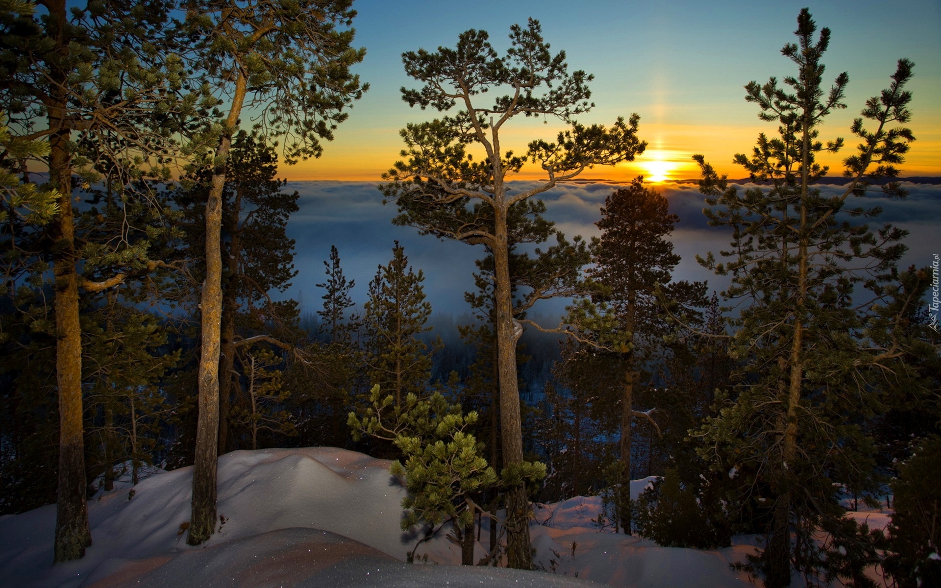 Edytor tapety: Las, Zima, Chmury, Wschód Słońca
