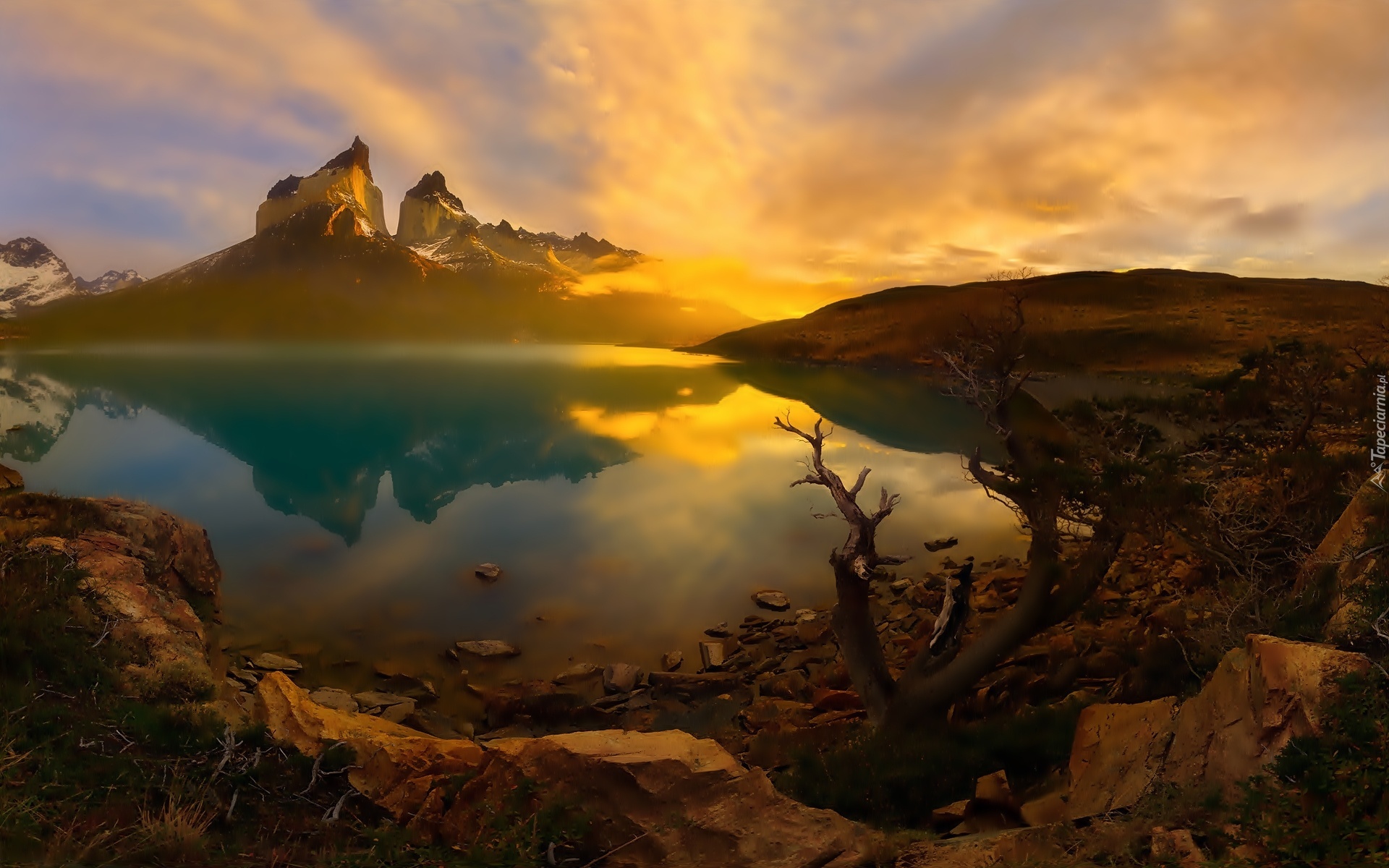 Edytor tapety: Góry, Jezioro, Skały, Zachód Słońca, Chile