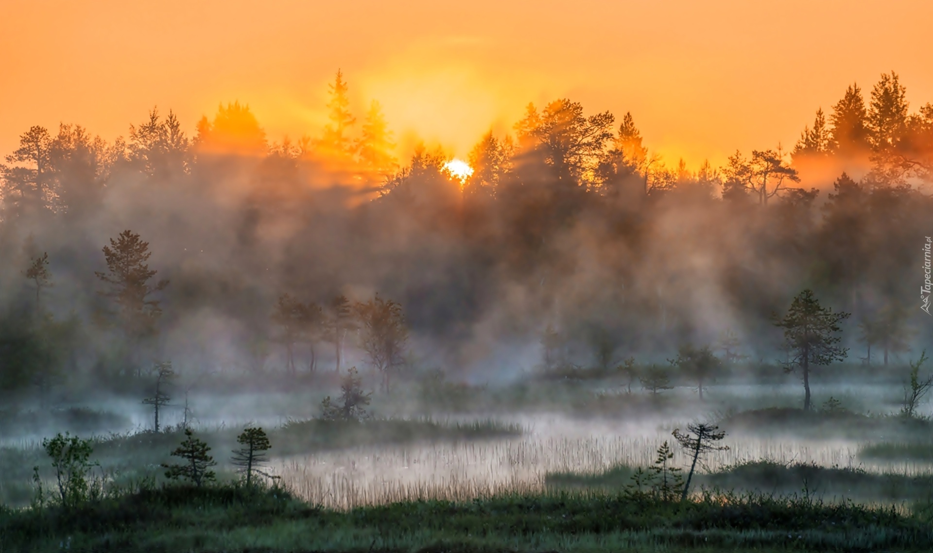 Edytor tapety: Mgła, Drzewa, Wschód słońca
