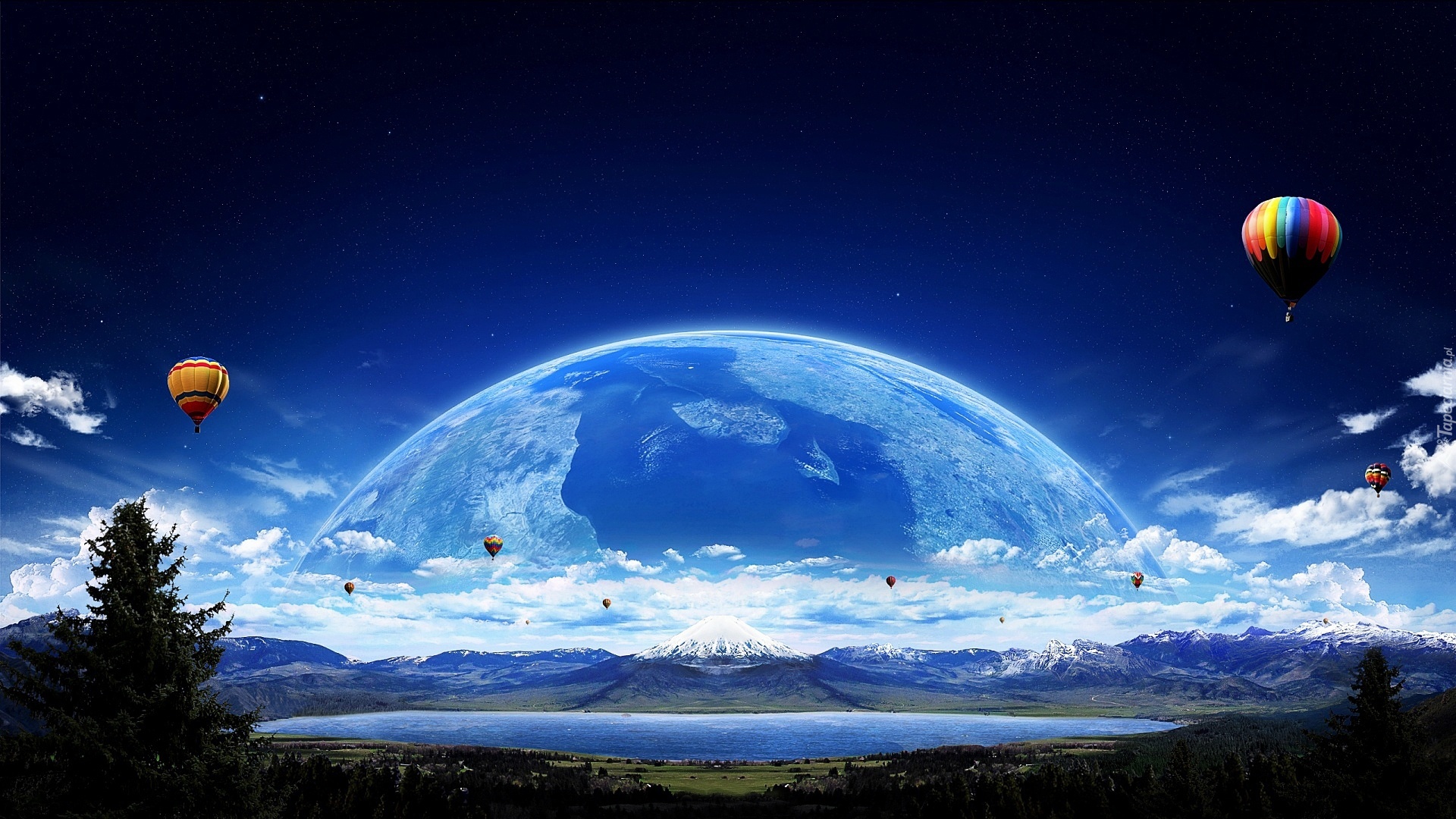 Edytor tapety: Grafika, Fantasy, Jezioro, Góry, Balony