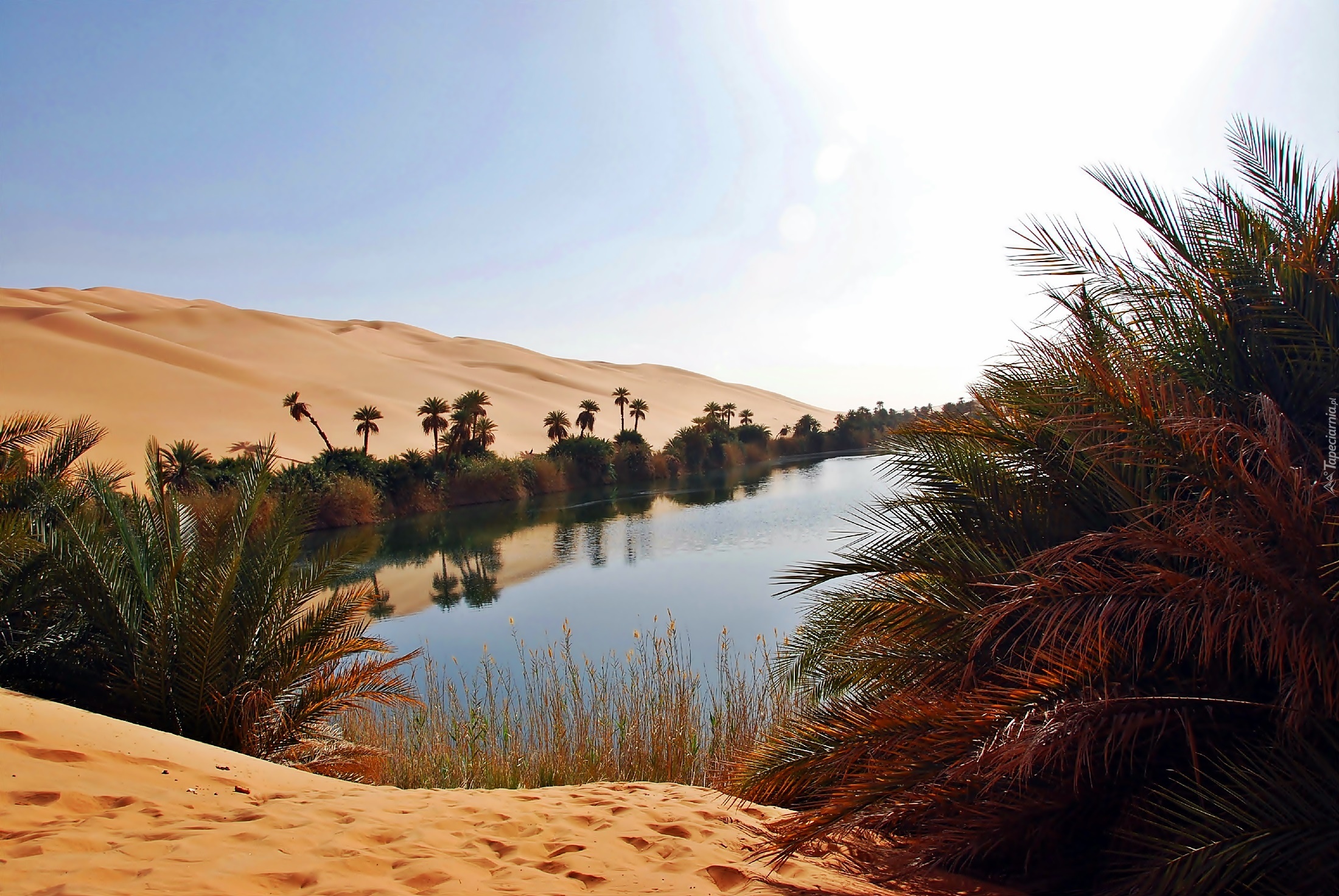 Edytor tapety: Pustynia, Oaza, Jezioro, Palmy