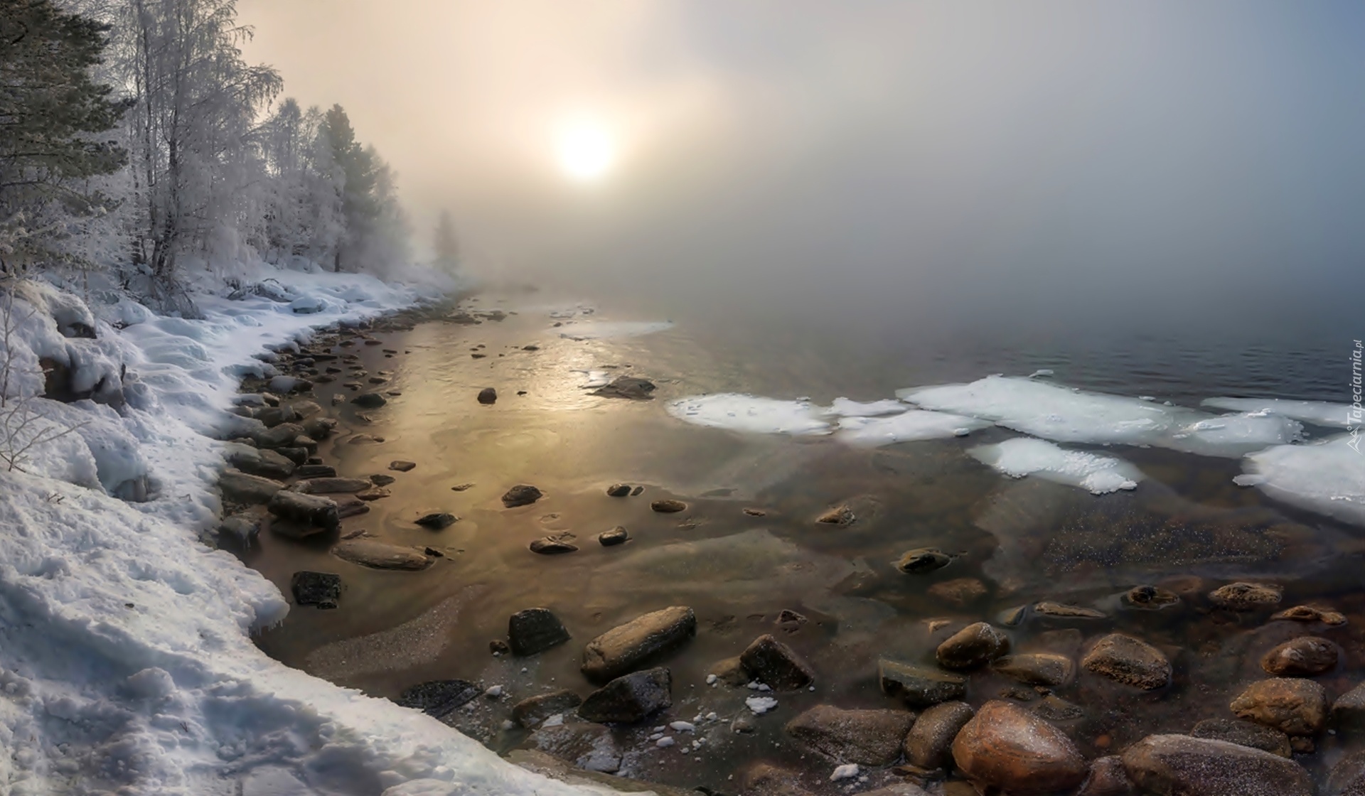Edytor tapety: Jezioro, Zima, Kamienie, Mgła