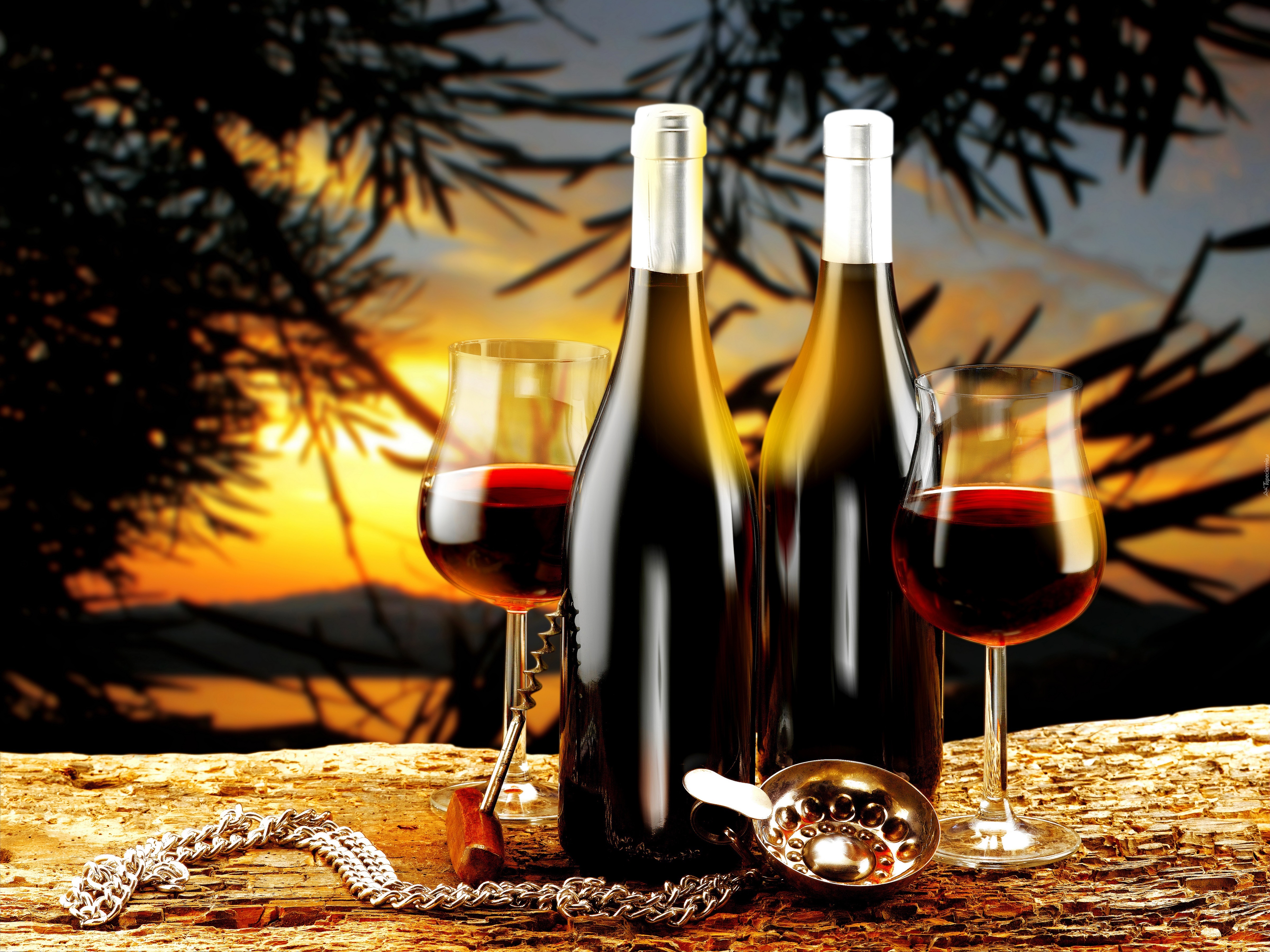 Edytor tapety: Wino, Kieliszki, Drzewa, Zachód Słońca