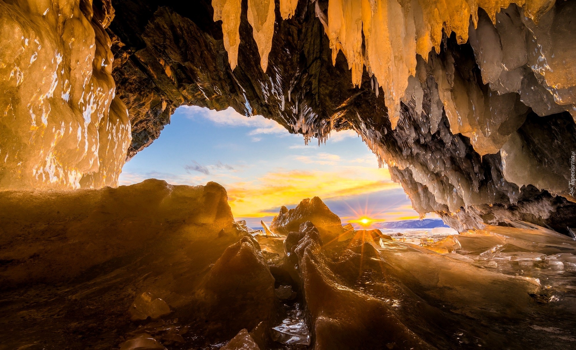 Edytor tapety: Jaskinia, Lód, Wzgórza, Wschód Słońca