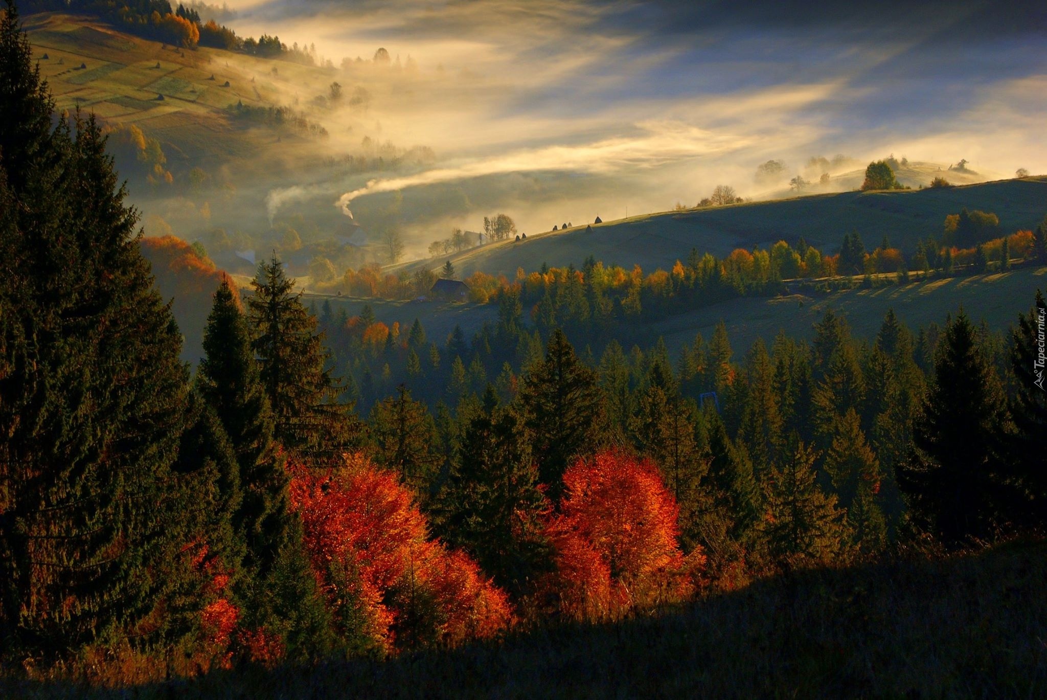 Edytor tapety: Lasy, Wzgórza, Mgła, Niebo