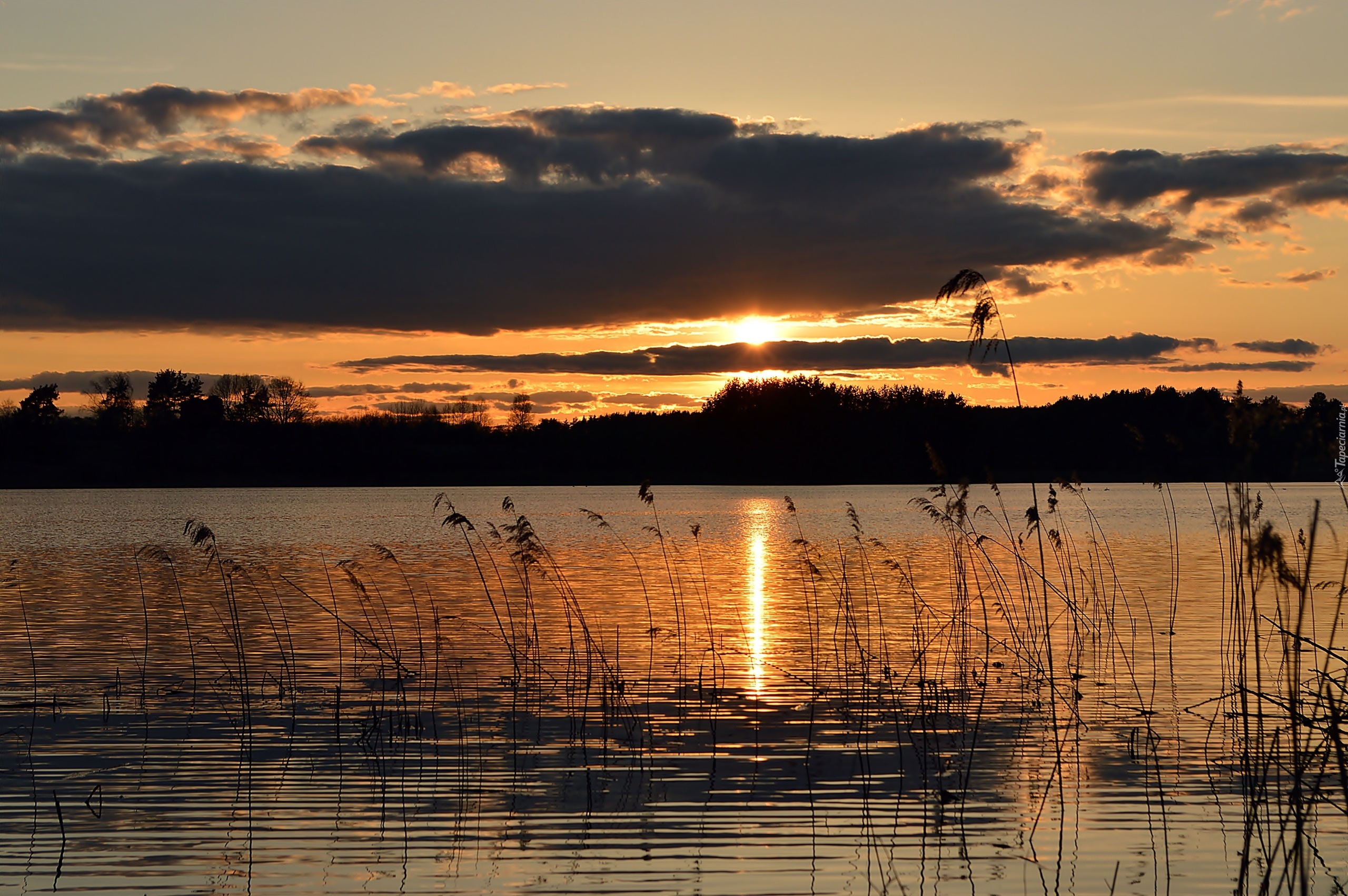 Edytor tapety: Jezioro, Zachód, Słońca, Chmury, Suche, Trawy