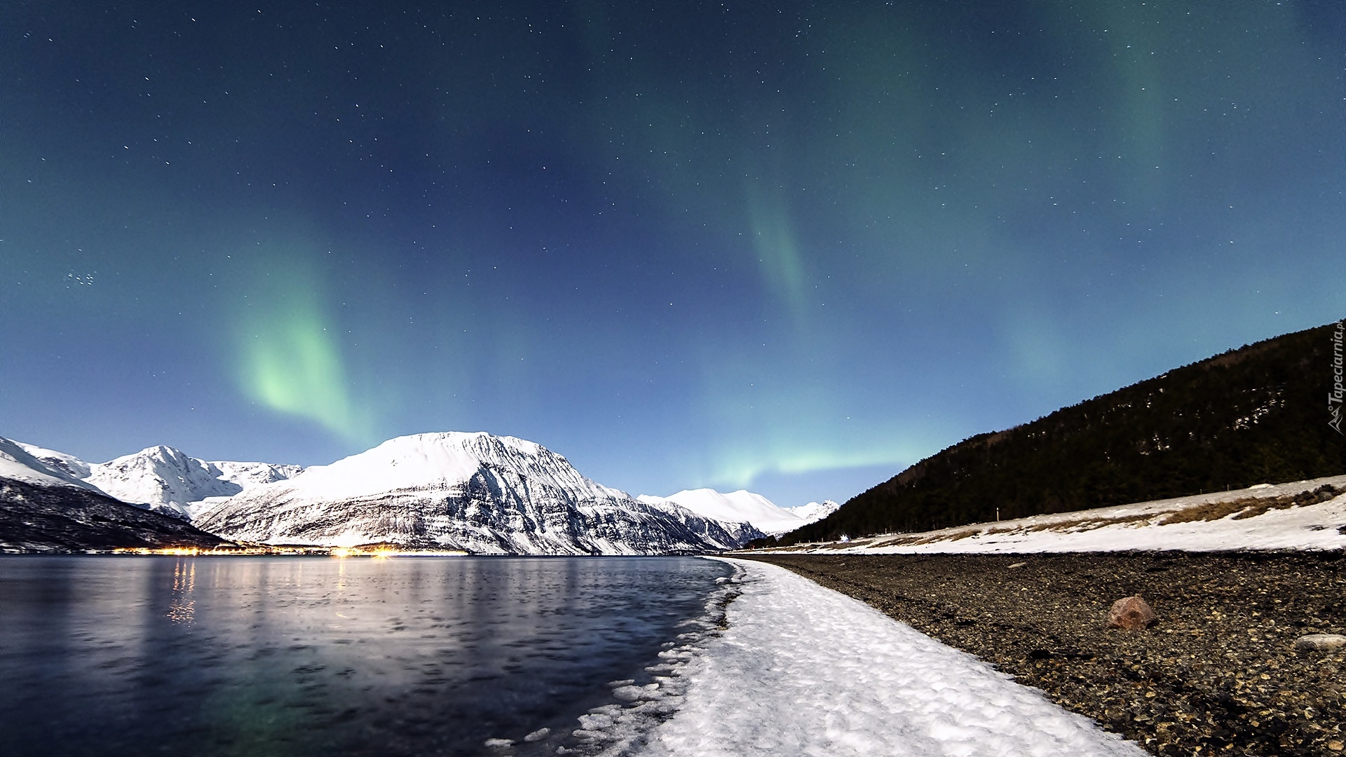 Edytor tapety: Zima, Góry, Jezioro, Zorza
