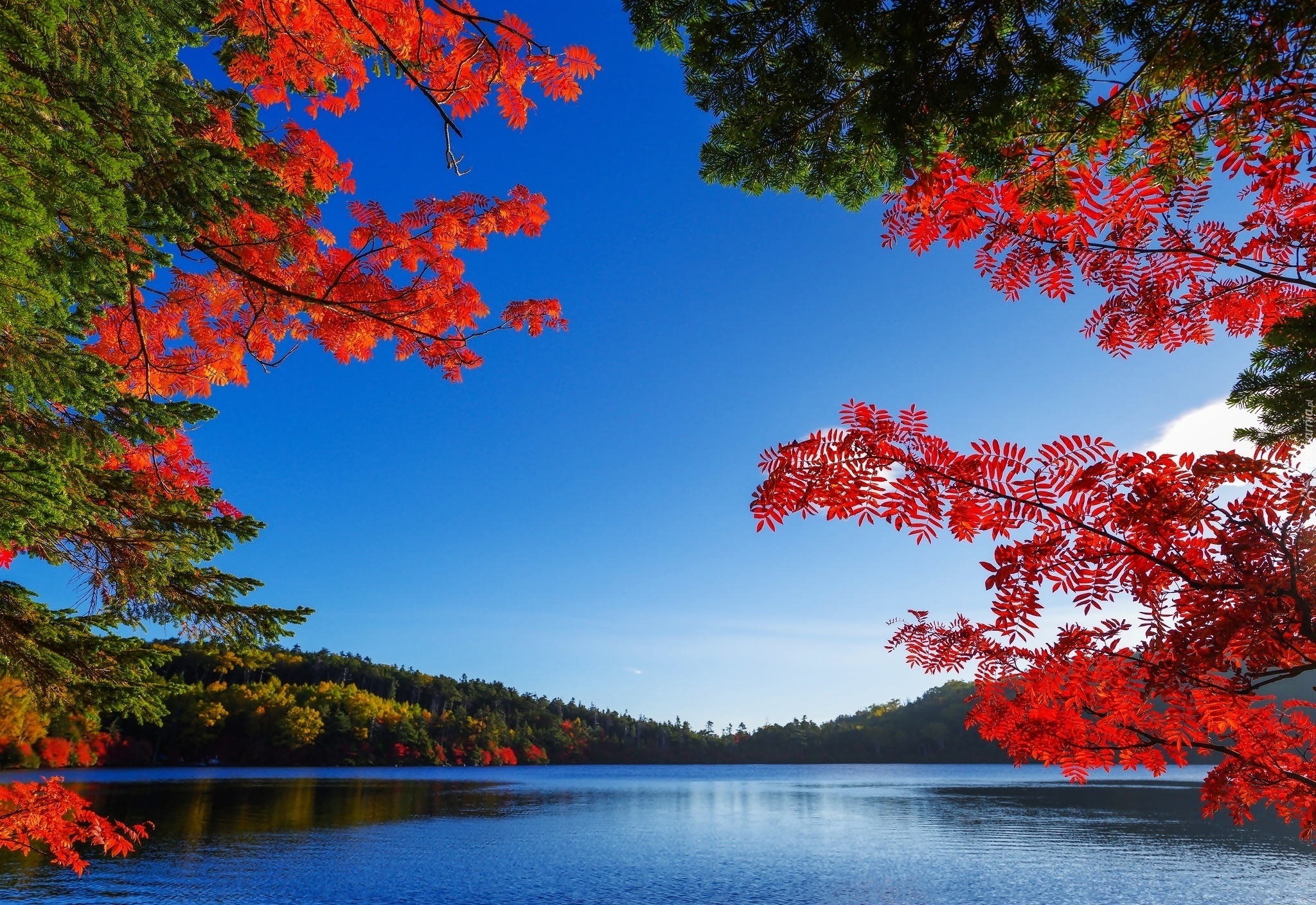 Edytor tapety: Jezioro, Drzewa, Gałęzie, Kolorowe, Liście