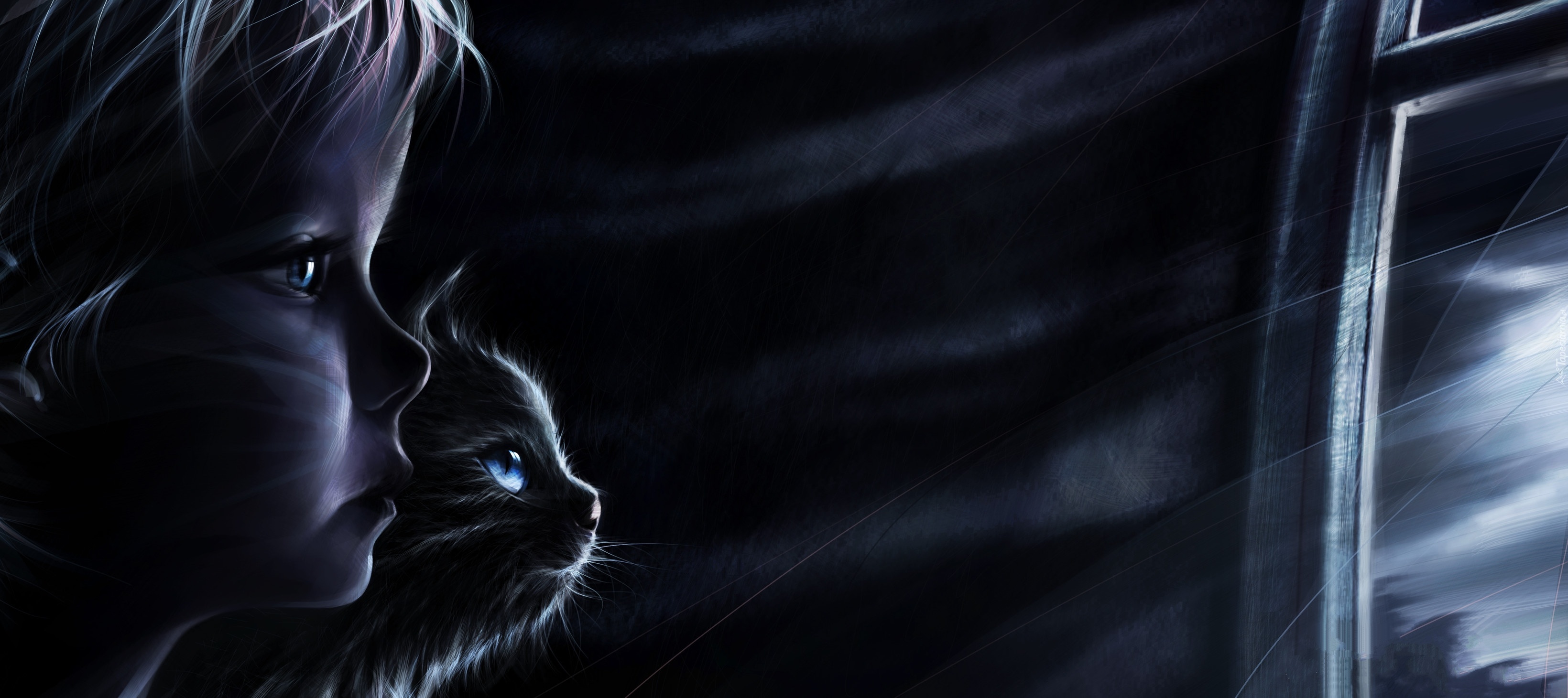 Edytor tapety: Grafika, Chłopiec, Dziecko, Kot, Okno