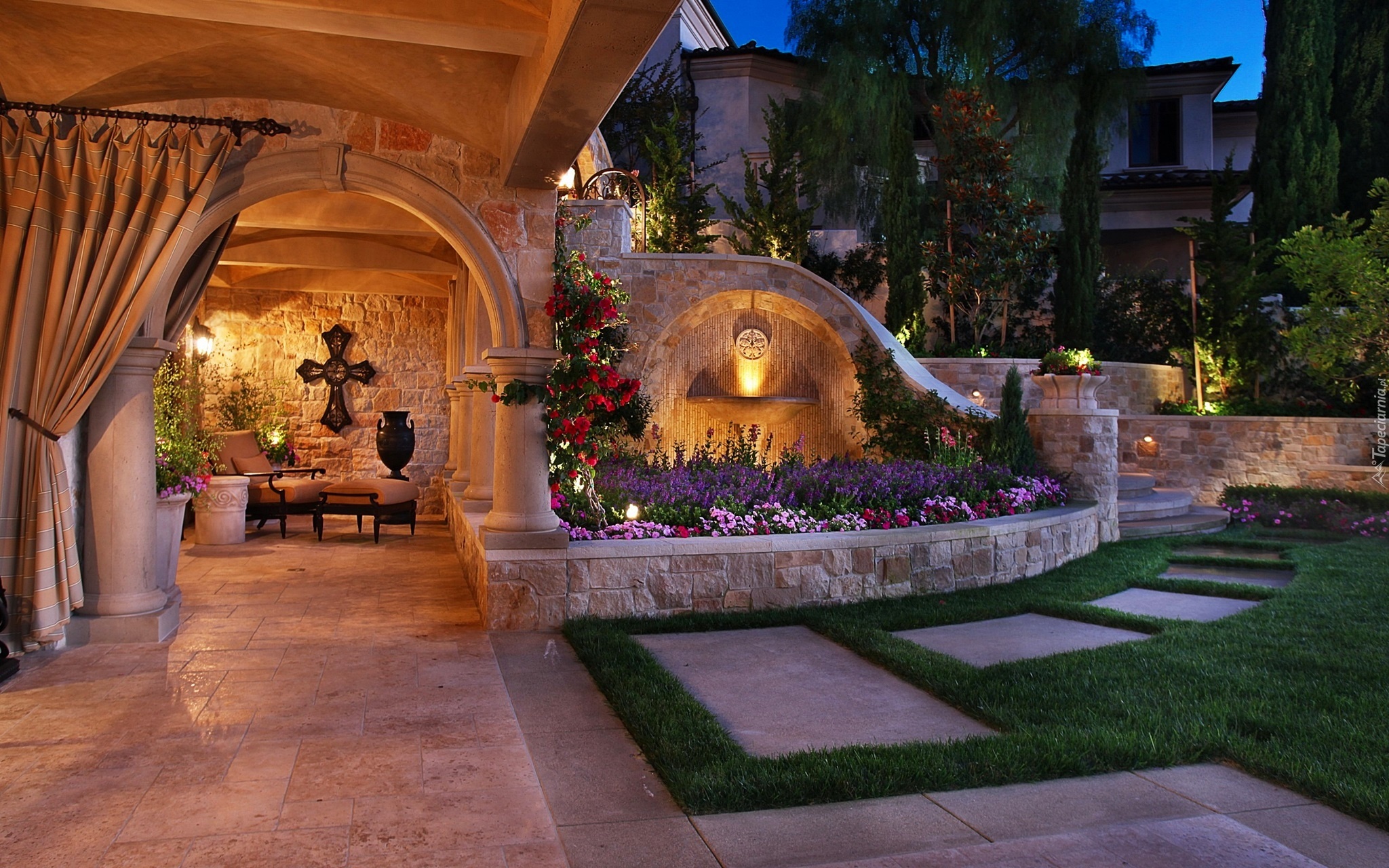 Edytor tapety: Dom, Ogród, Oświetlony, Taras, Zmrok
