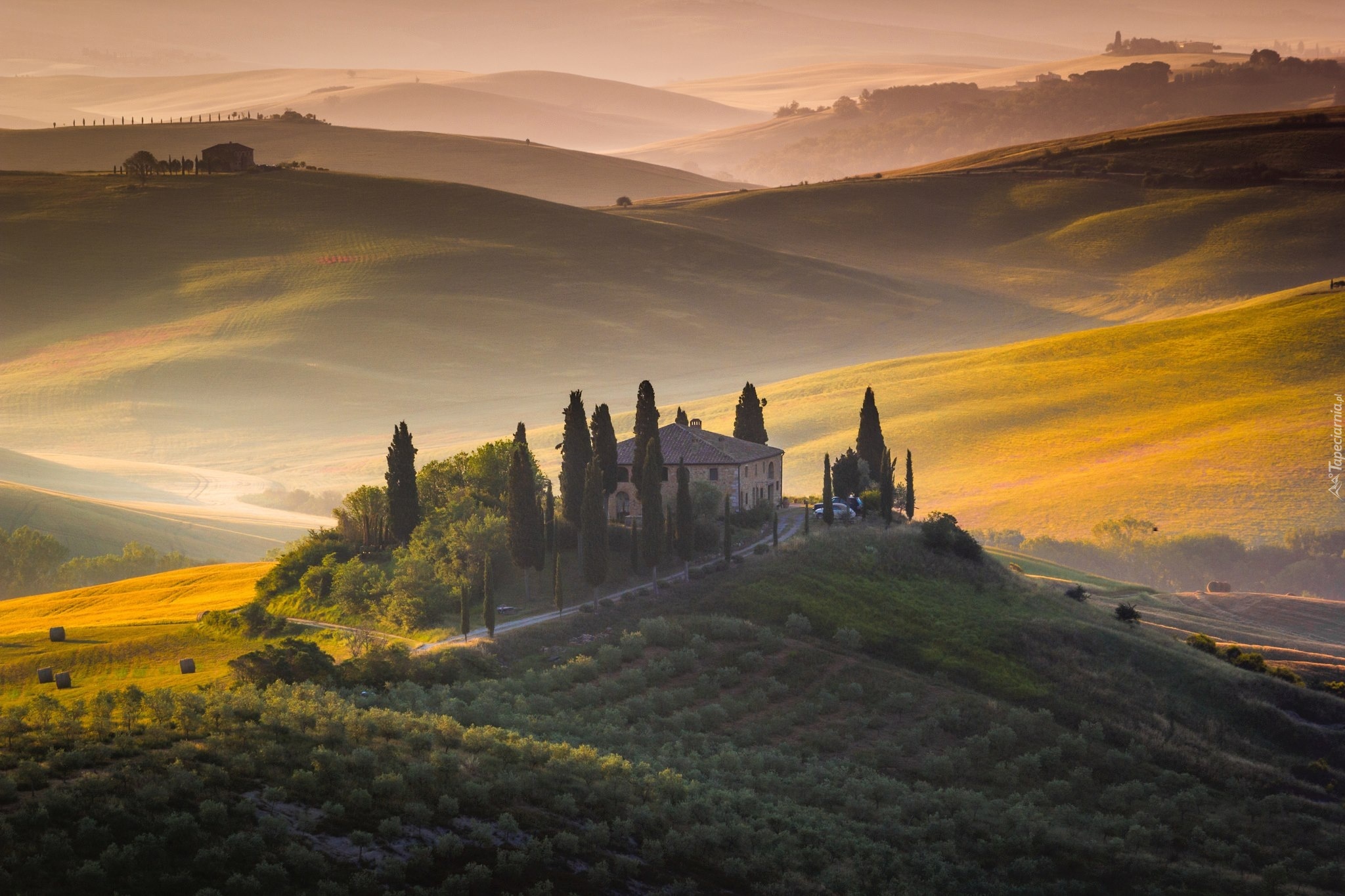 Edytor tapety: Dom, Wzgórza, Mgła, Toskania