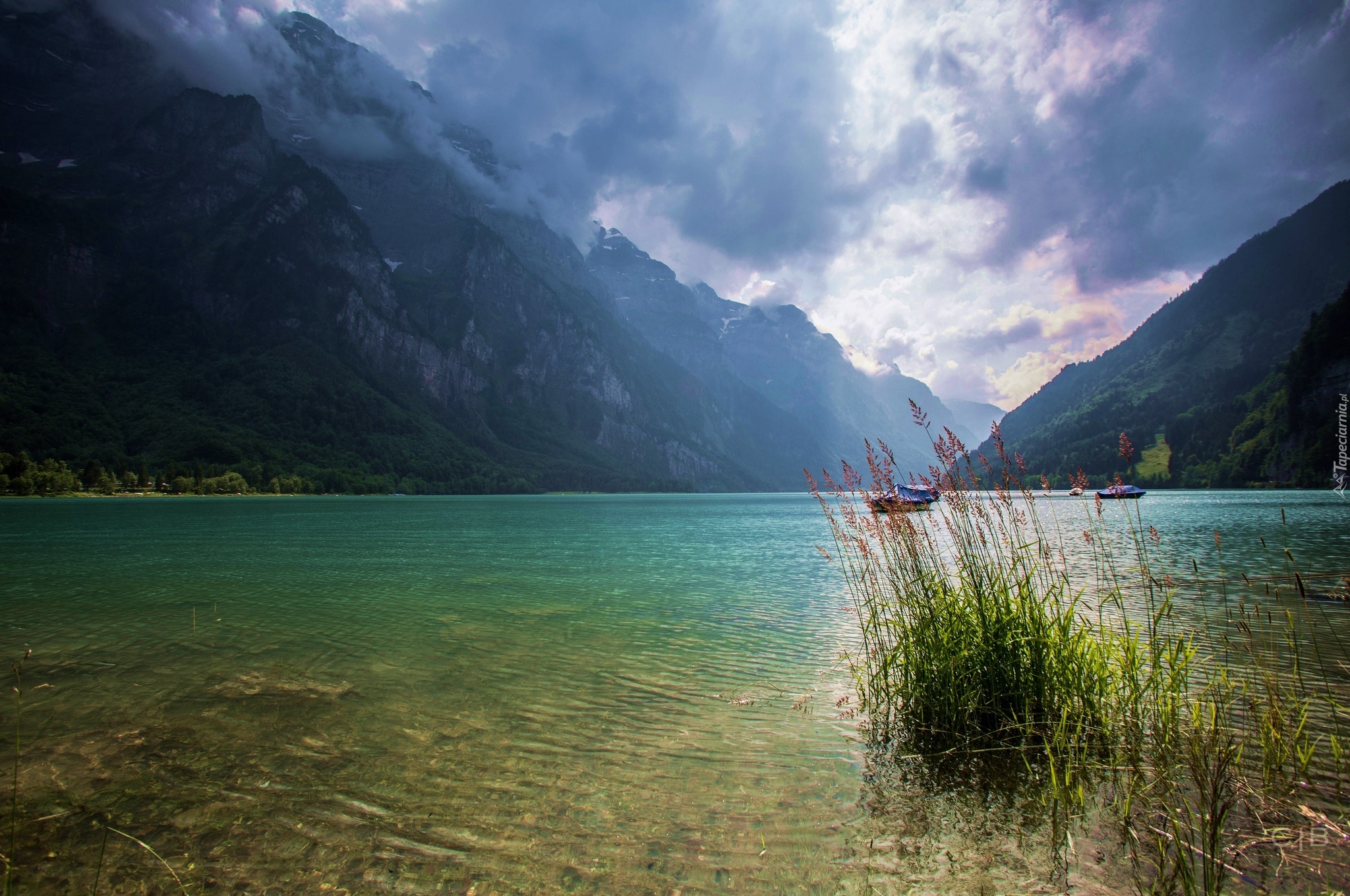 Edytor tapety: Góry, Jezioro, Łódki, Szwajcaria