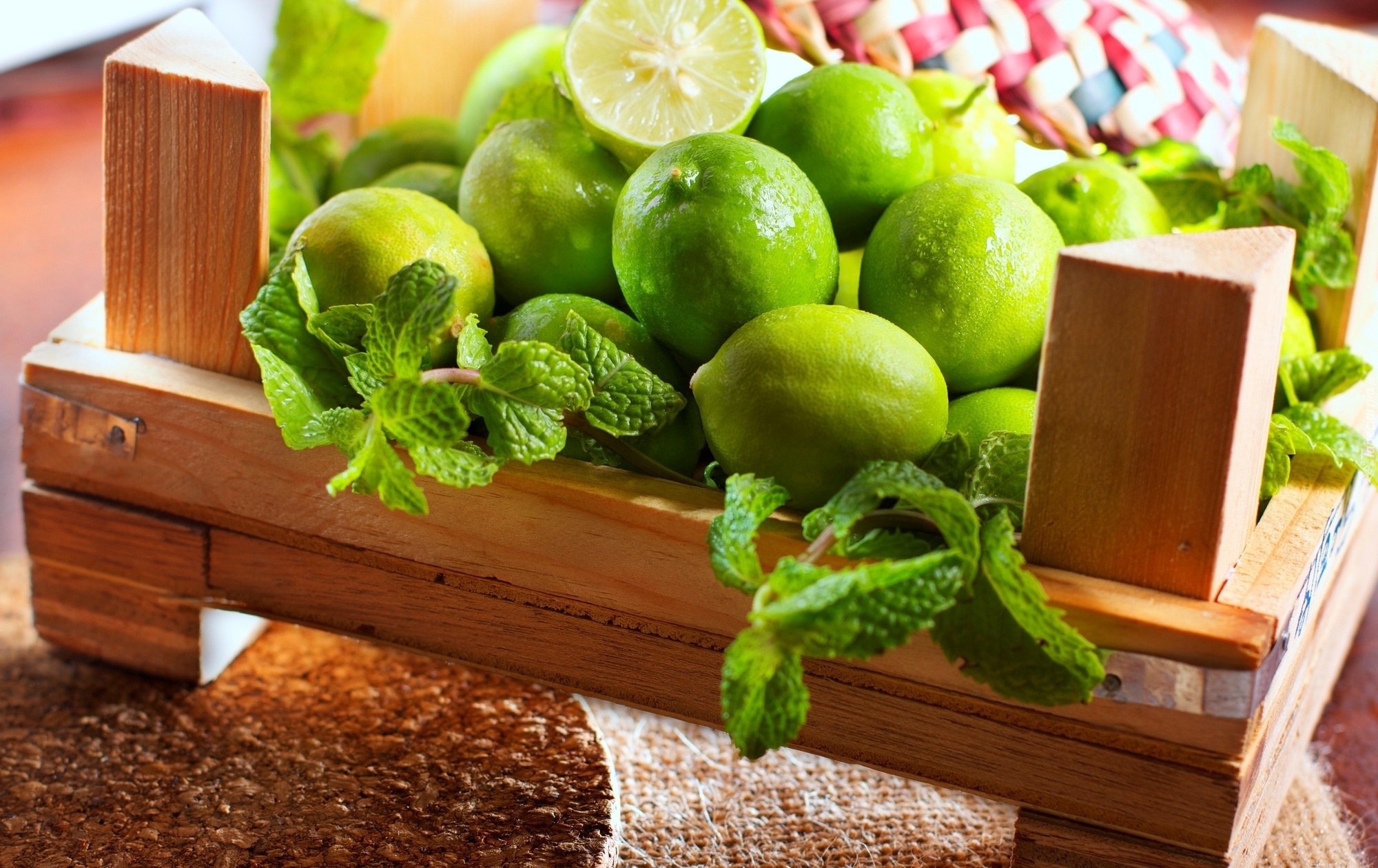 Edytor tapety: Owoce, Skrzynka, Zielone Limonki, Listki, Stół