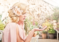 Edytor tapety: Kobieta, Blondynka, Kwiaty, Sukienka, Ogród, Żaba