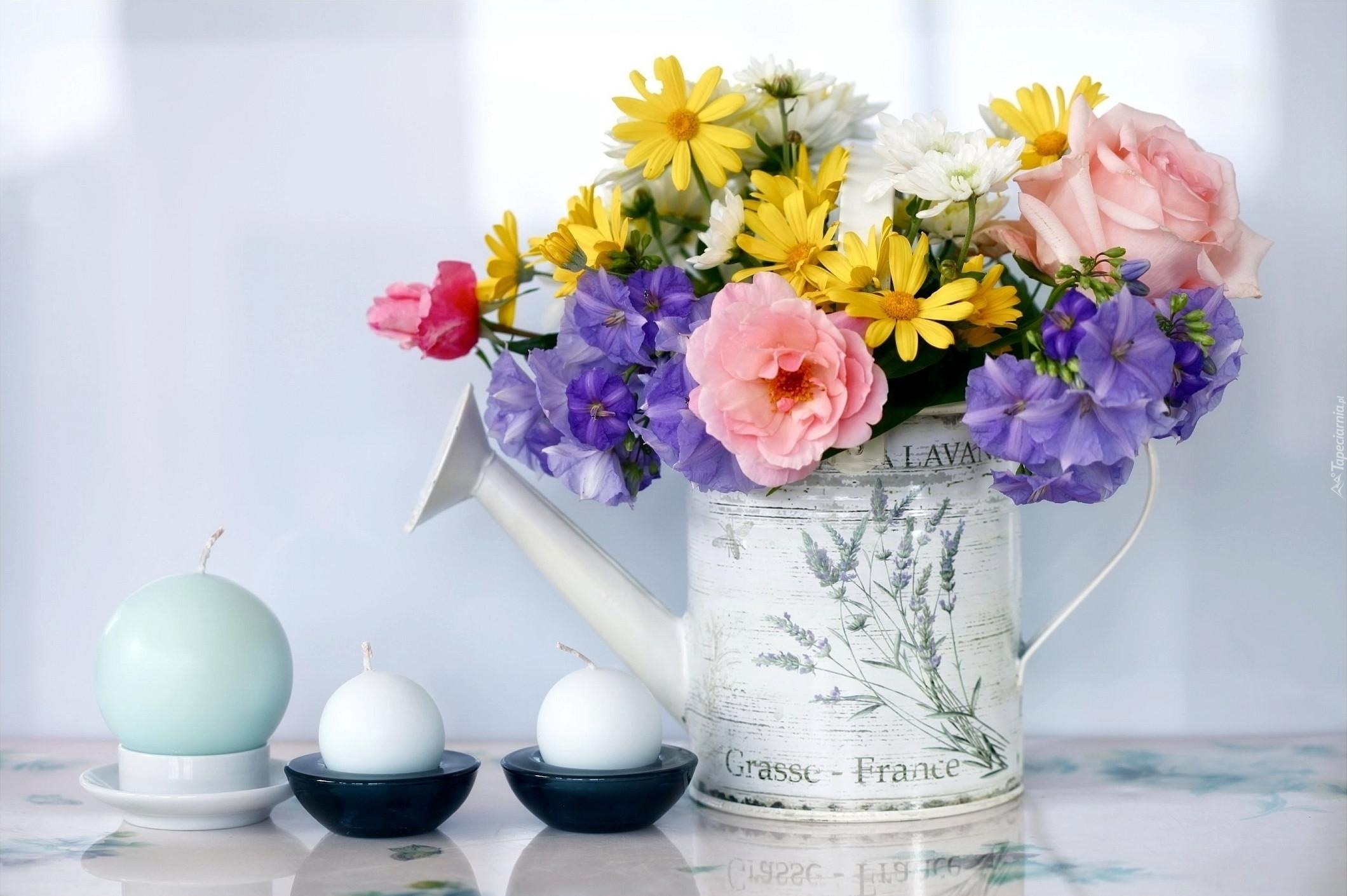 Edytor tapety: Kwiaty, Konewka, Świeczki, Kompozycja