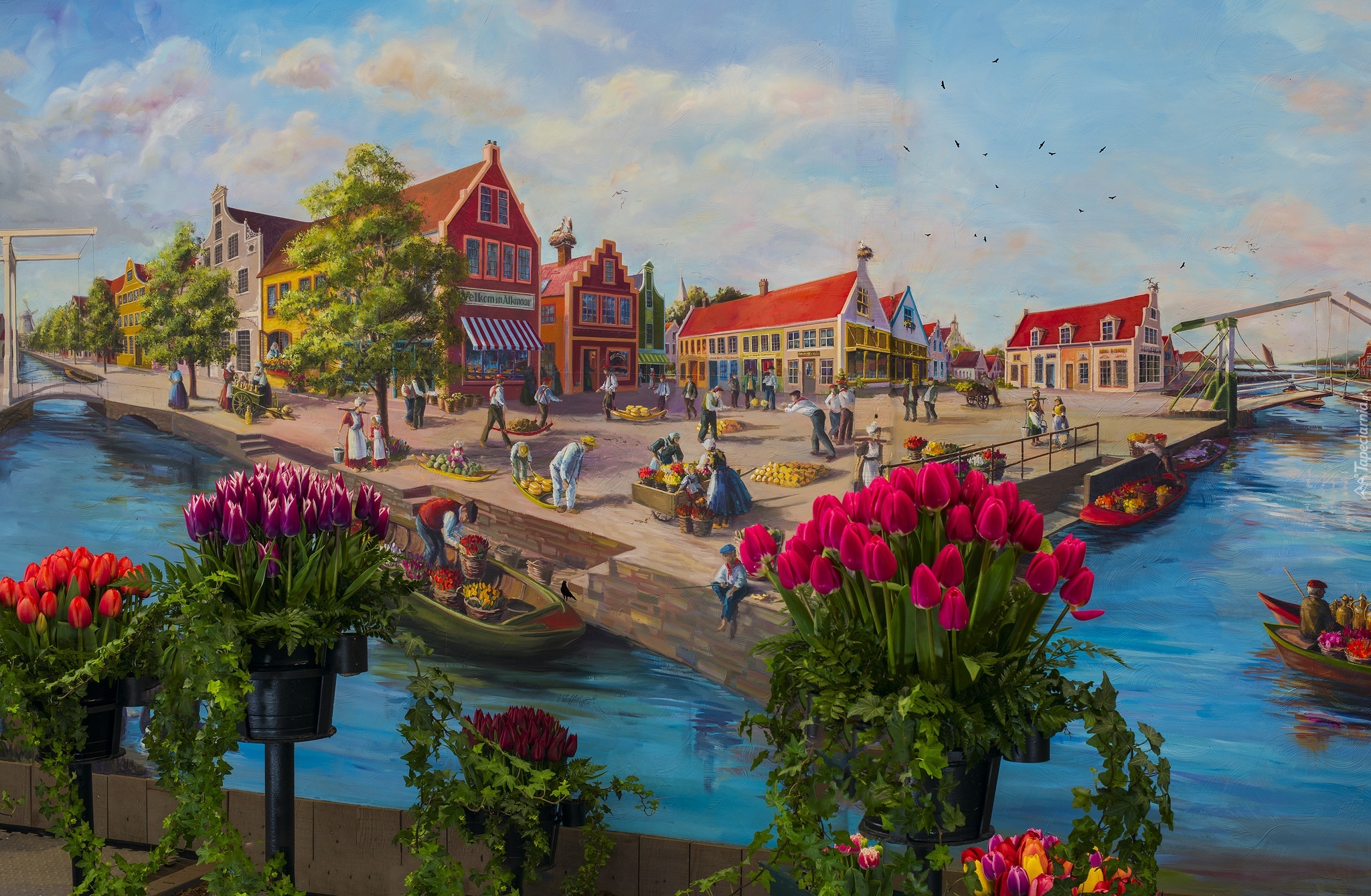 Edytor tapety: Holandia, Kwiaty, Tulipany, Domy, Obraz