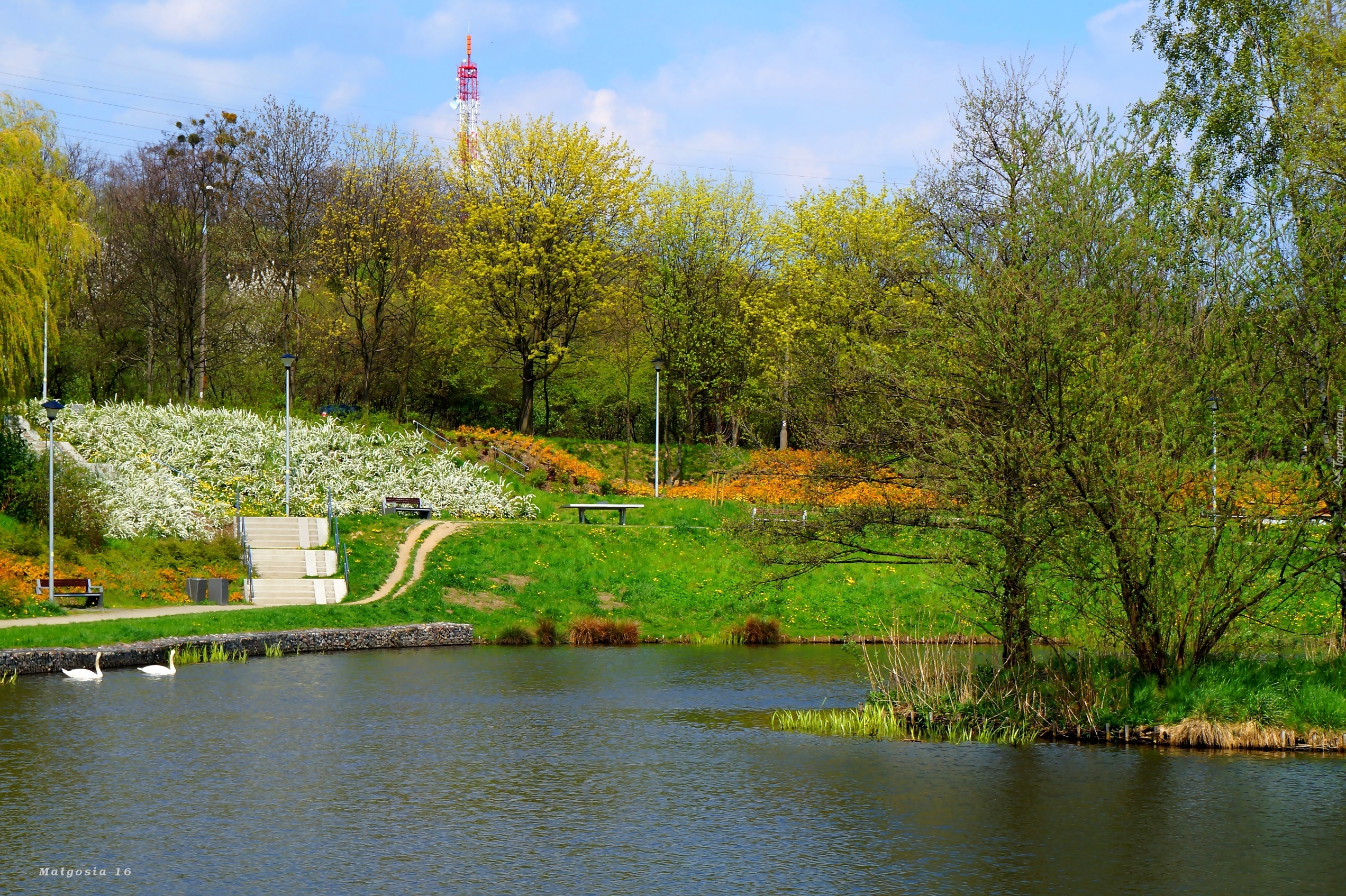 Edytor tapety: Jeziorko, Woda, Łabędzie, Zieleń, Drzewa