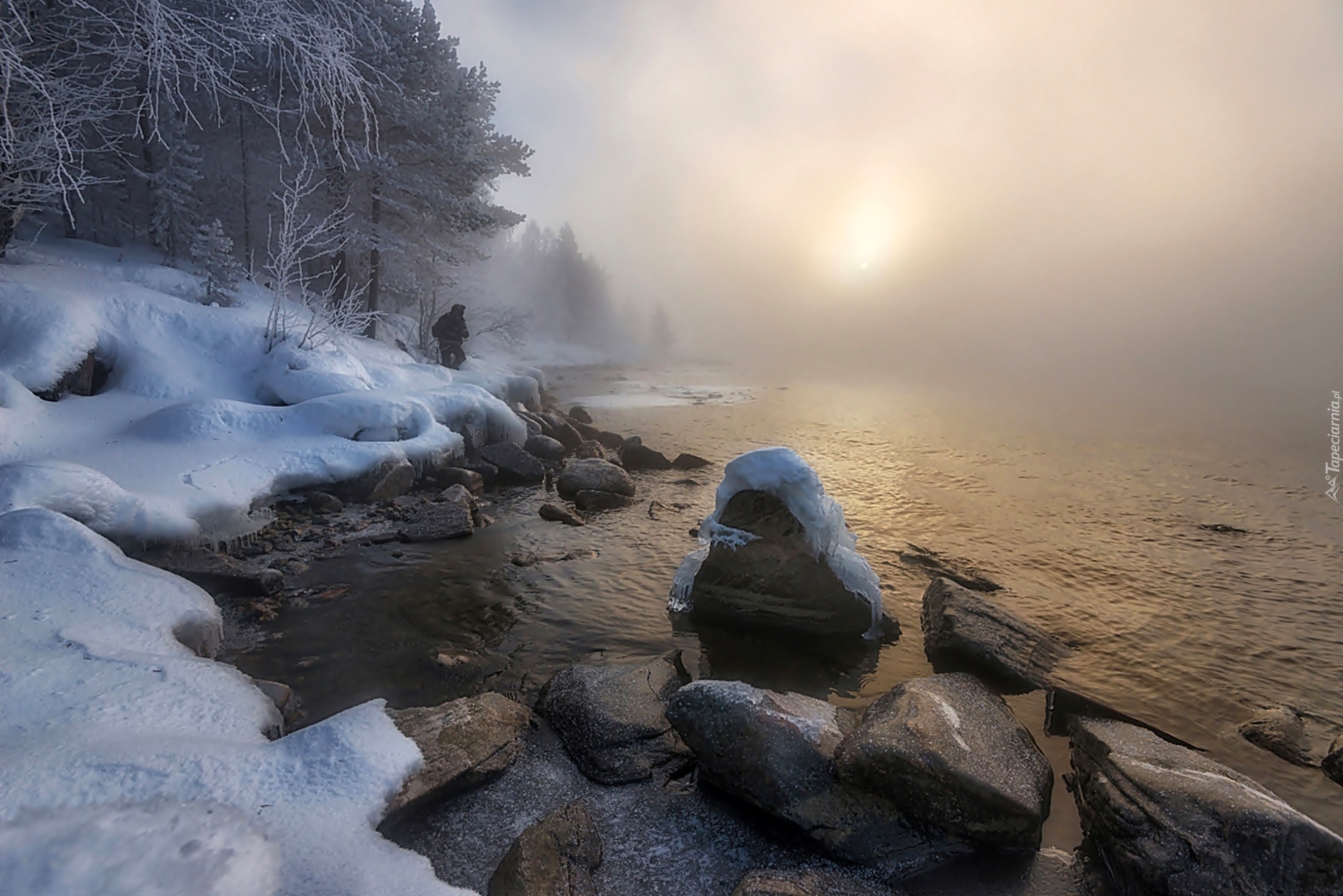 Edytor tapety: Jezioro, Mgła, Kamienie, Las, Postać