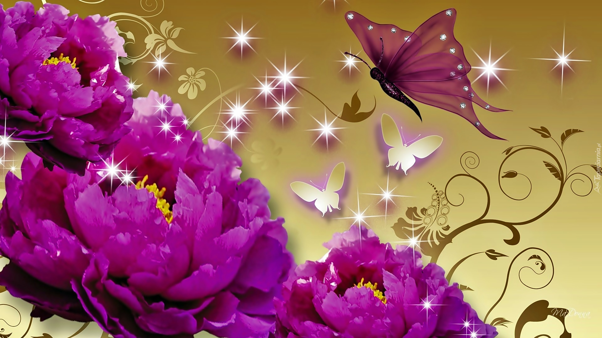 Edytor tapety: Piwonie, Motyle, Grafika, 2D