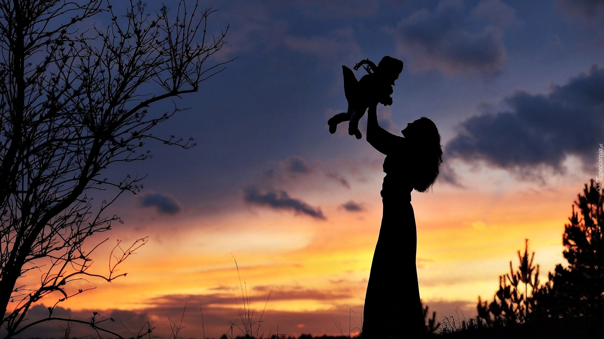 Edytor tapety: Kobieta, Matka, Dziecko, Zachód, Słońca, Drzewo