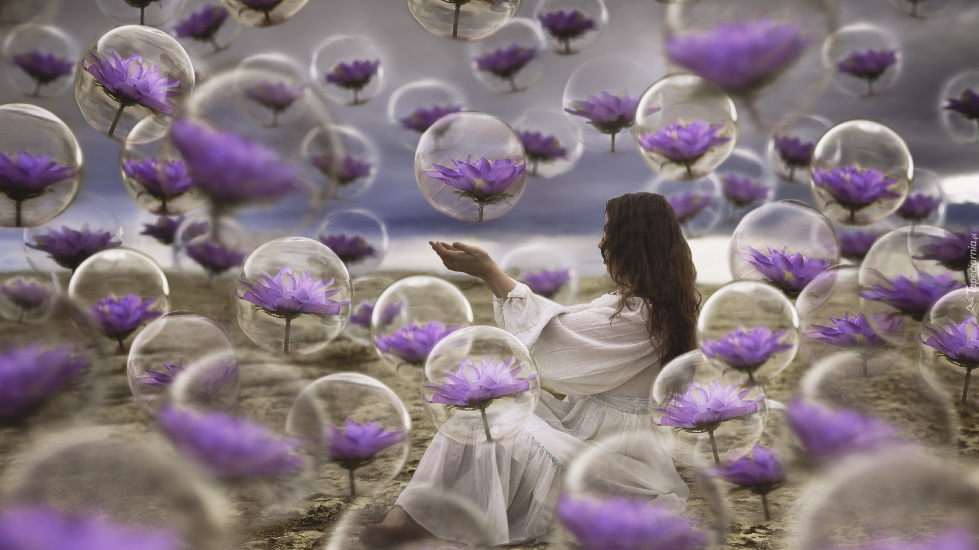 Edytor tapety: Bańki, Fioletowe, Kwiaty, Dziewczyna