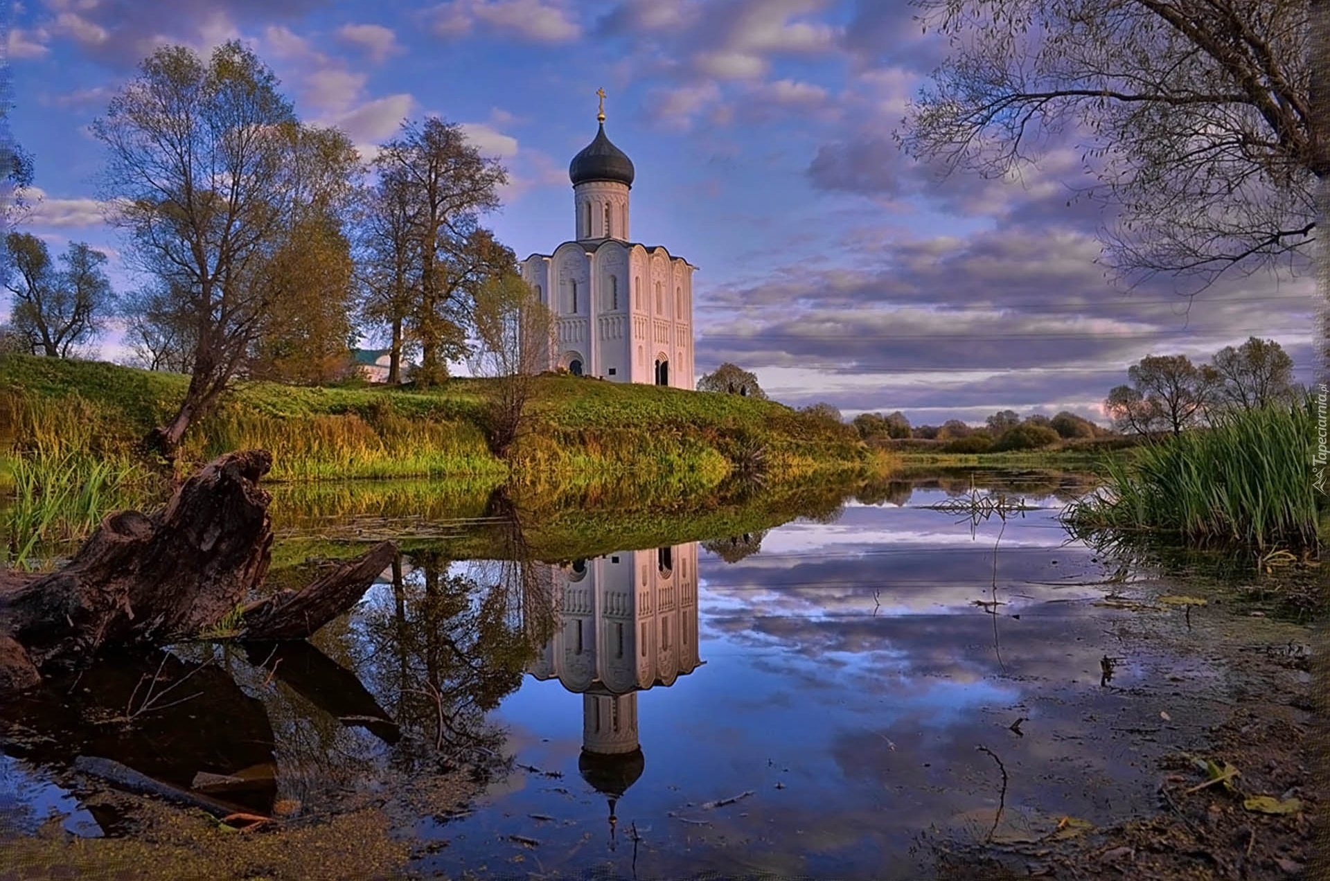 Edytor tapety: Cerkiew, Rzeka, Chmury, Drzewa