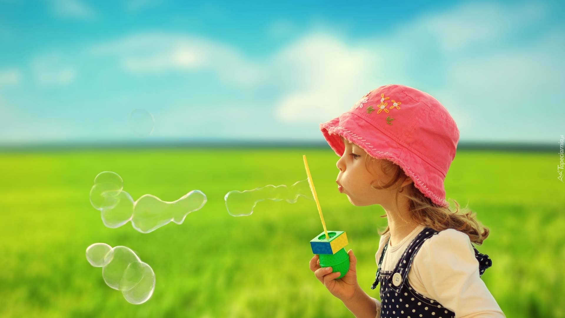 Edytor tapety: Dziecko, Dziewczynka, Łąka, Bańki Mydlane