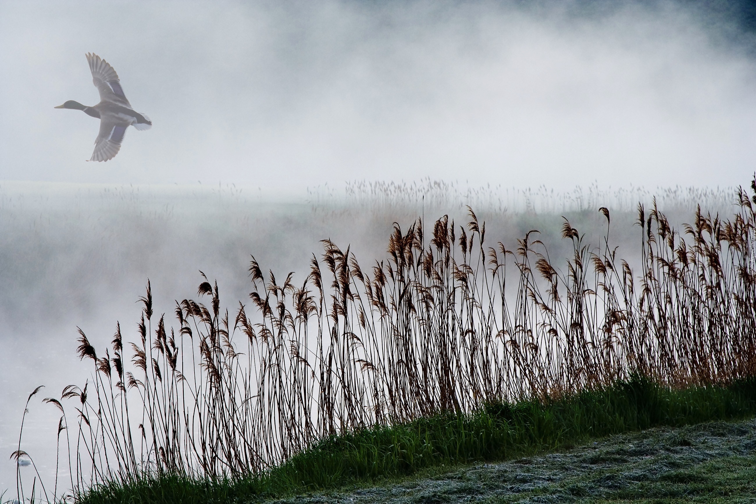 Edytor tapety: Mgła, Jezioro, Trawa, Kaczka