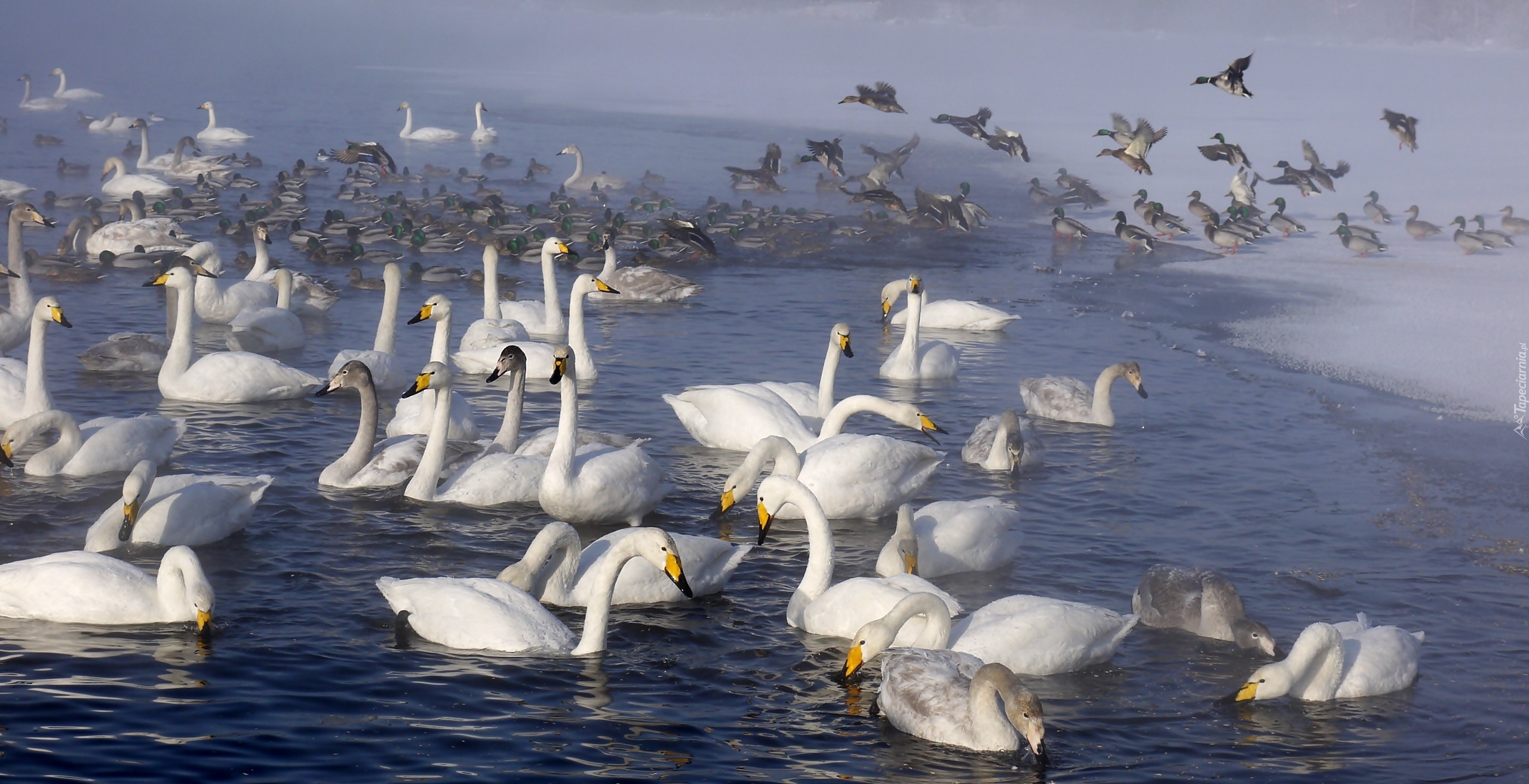 Edytor tapety: Jezioro, Łabędzie, Kaczki, Mgła