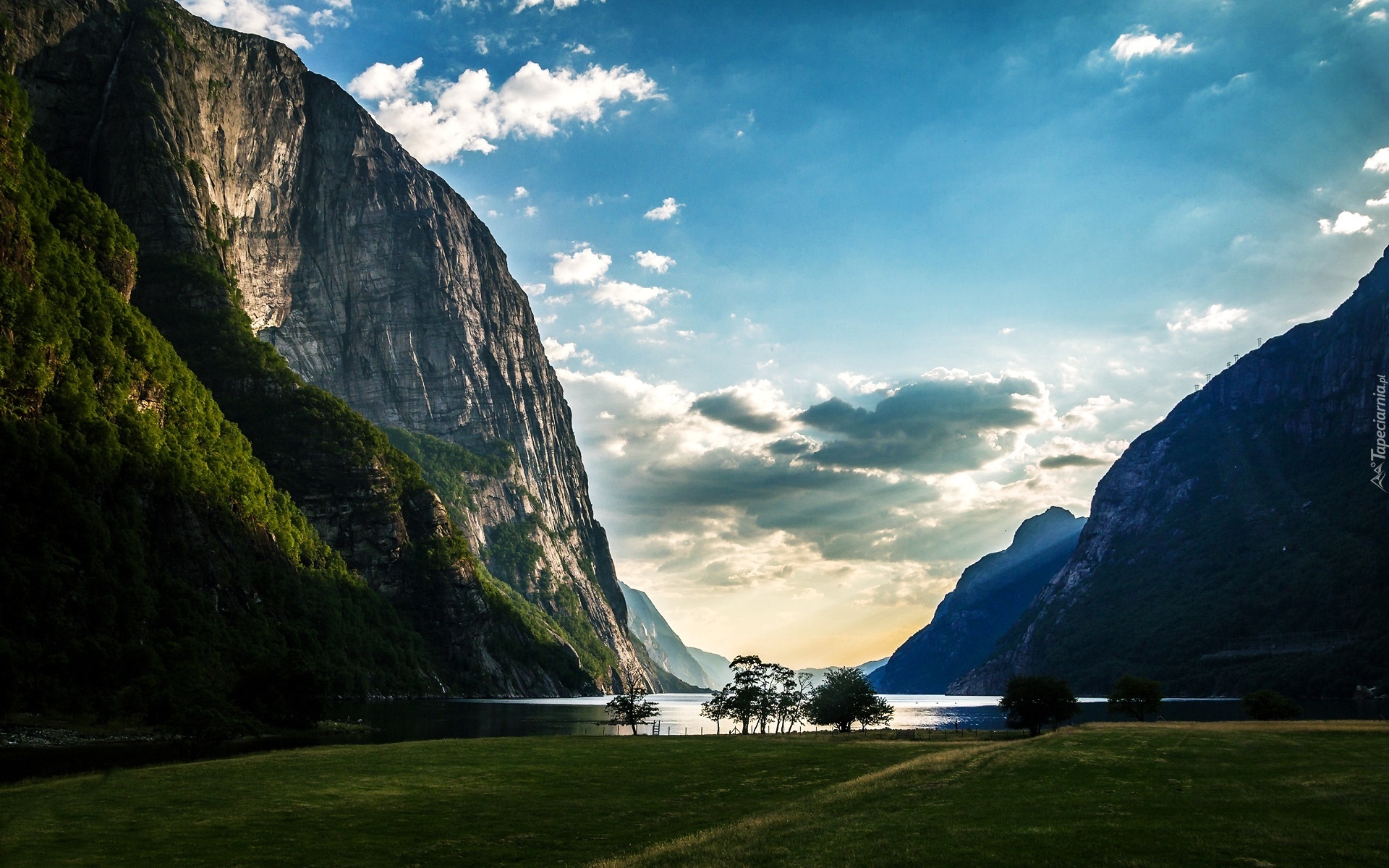 Edytor tapety: Góry, Chmury, Jezioro, Wieczór, Zmierzch, Drzewa