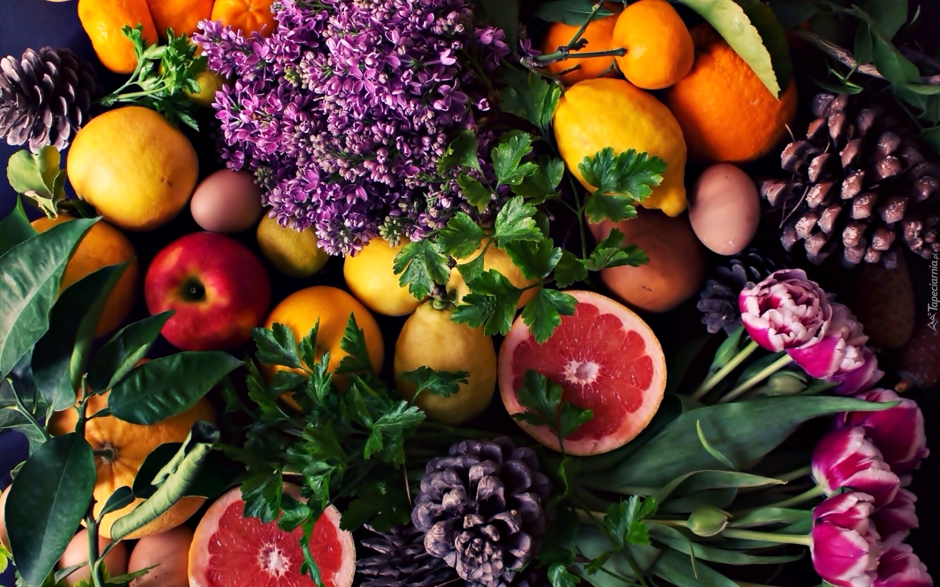 Edytor tapety: Tulipany, Bzy, Cytryny, Pomarańcze, Jabłka