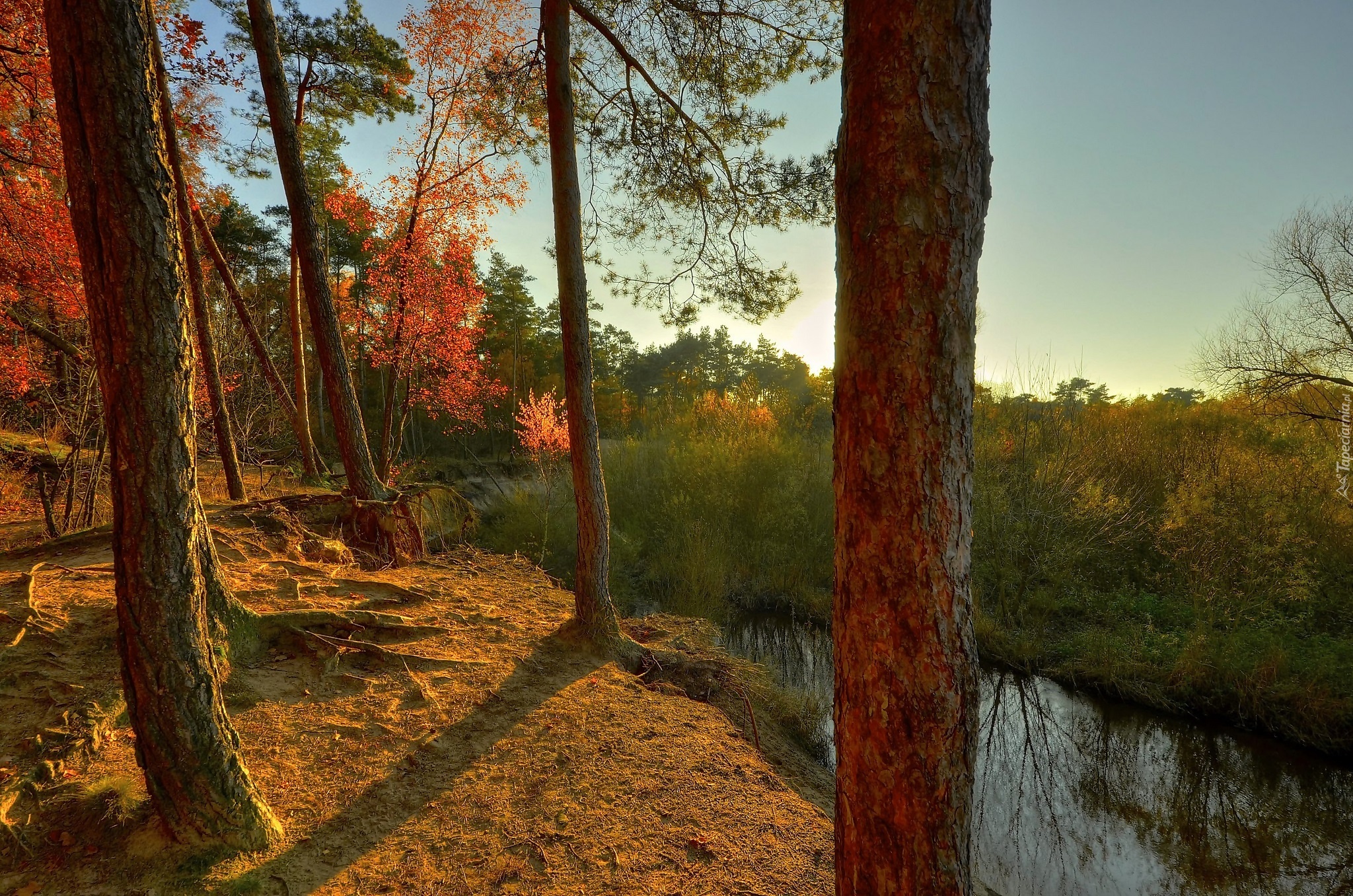 Edytor tapety: Las, Drzewa, Strumyk, Przebijające Światło